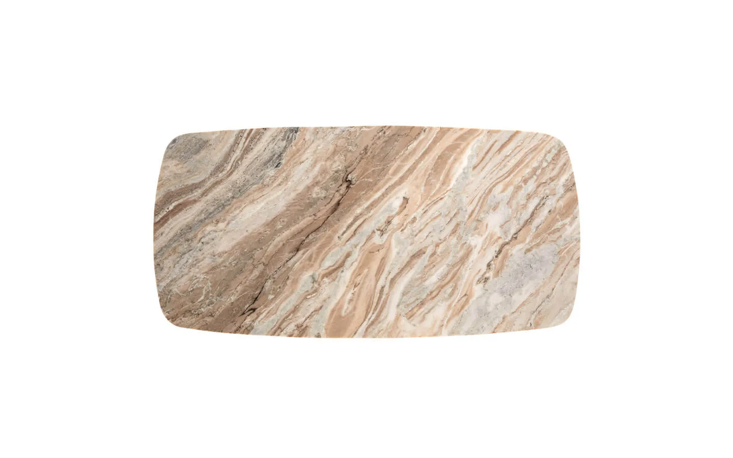 BOTTEGA BLUSH BEIGE от RICHMOND INTERIORS е изтънчена холна маса, която се откроява с меката си елегантност и съвременен характер. Плотът ѝ е изпълнен в красив нюанс blush beige от нежен мрамор, който носи светлина и усещане за спокойствие в интериора. Повърхността изглежда фина и луксозна, с деликатни шарки, които придават дълбочина и естествена текстура. Основата е оформена от метал в топъл златист тон и създава модерна, лека и балансирана конструкция. Тънките линии и изчистеният силует подчертават изтънчения дизайн на модела, без да отклоняват вниманието от красивия плот. BOTTEGA BLUSH BEIGE се вписва в интериори, които търсят хармония, стил и премерен лукс. Тя е идеална като централен акцент в дневната – едновременно практична и естетически впечатляваща, превръщайки зоната около дивана в уютно, подредено и красиво пространство.