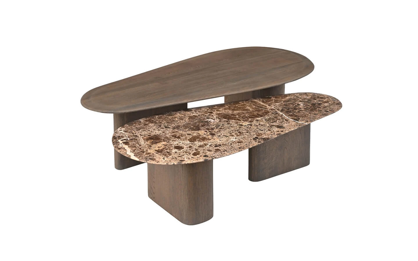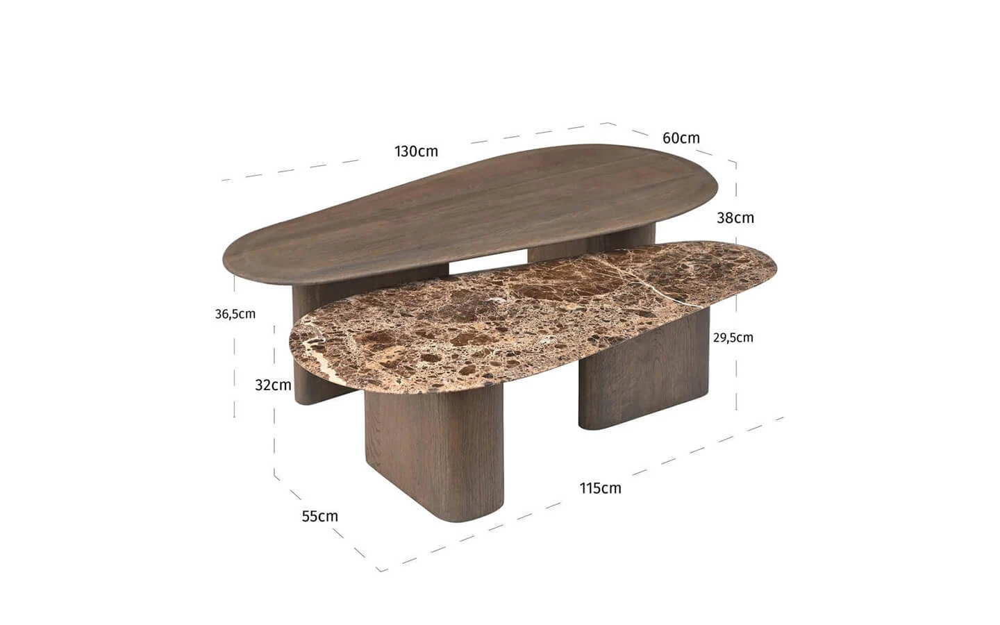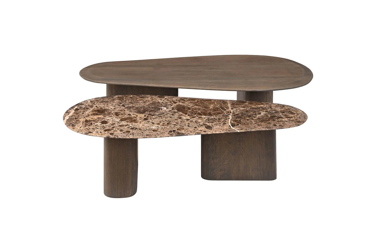 Сет от две холни маси CASTELLO SMOKED CHARCOAL от колекцията на нидерландския производител Richmond Interiors. Основата е изработена от дърво. При едната маса плотът е изработен от дърво – финиш Smoked Charcoal. При втората плотът е изработен от мрамор Emperador.