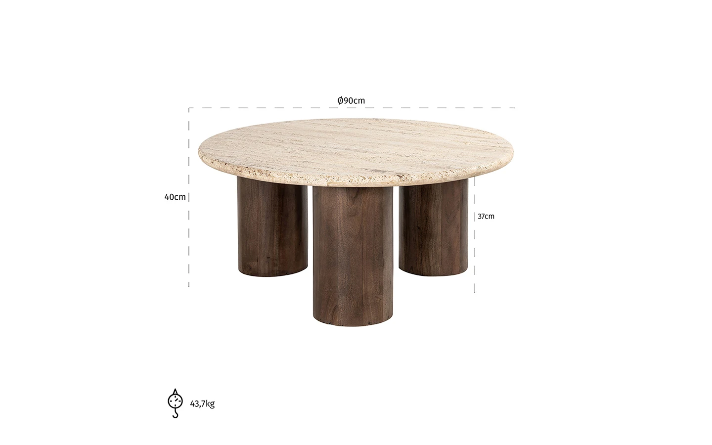DOUGLAS 90 е холна маса от колекцията на нидерландския производител Richmond Interiors. Основата е изработена от мангово дърво – финиш Brown. Плотът на холната маса е изработен от естествен мрамор Travertine.