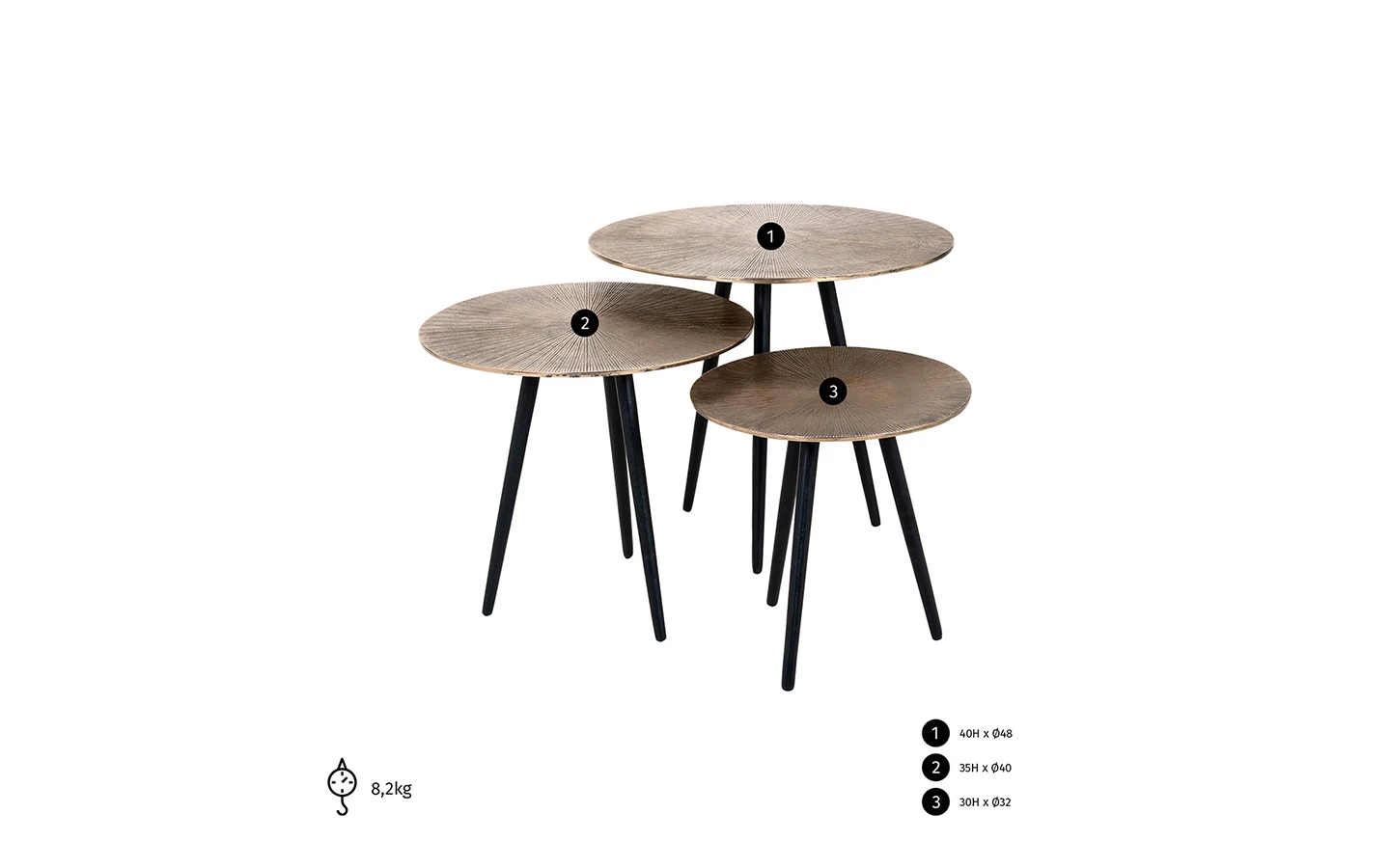 Сет от три холни маси VITTORIO от колекцията на нидерландския производител Richmond Interiors. Основата е изработена от метал. Плотът на холните маси са изработени от алуминий – финиш Champagne gold.