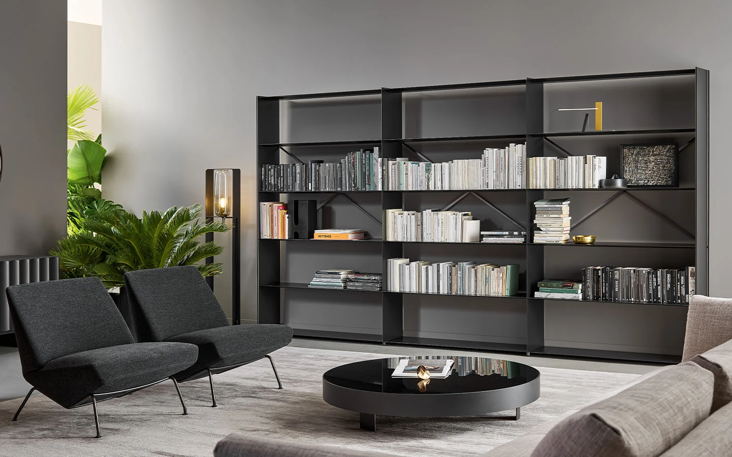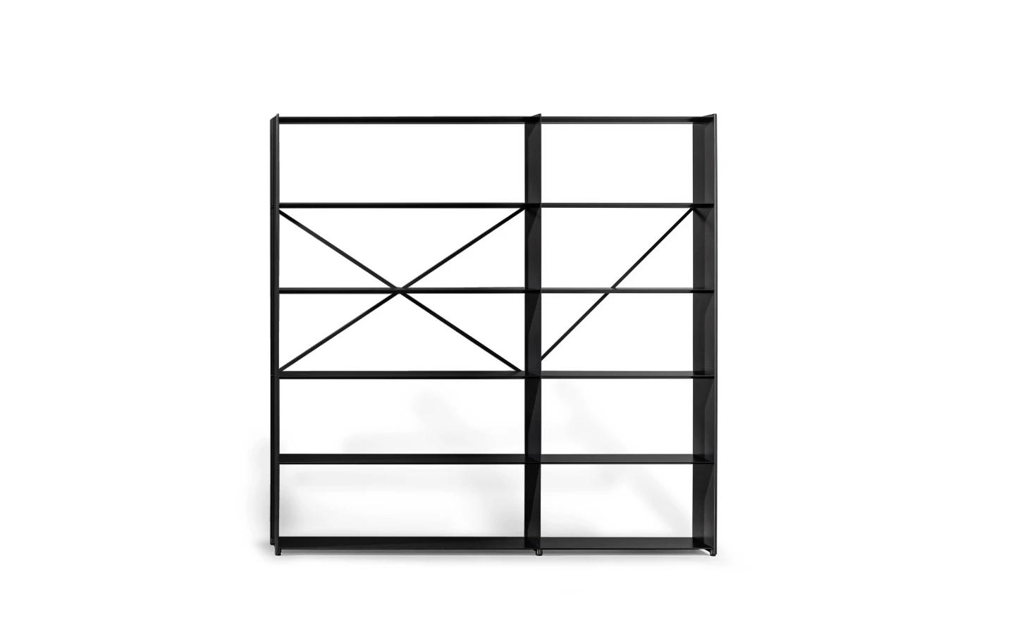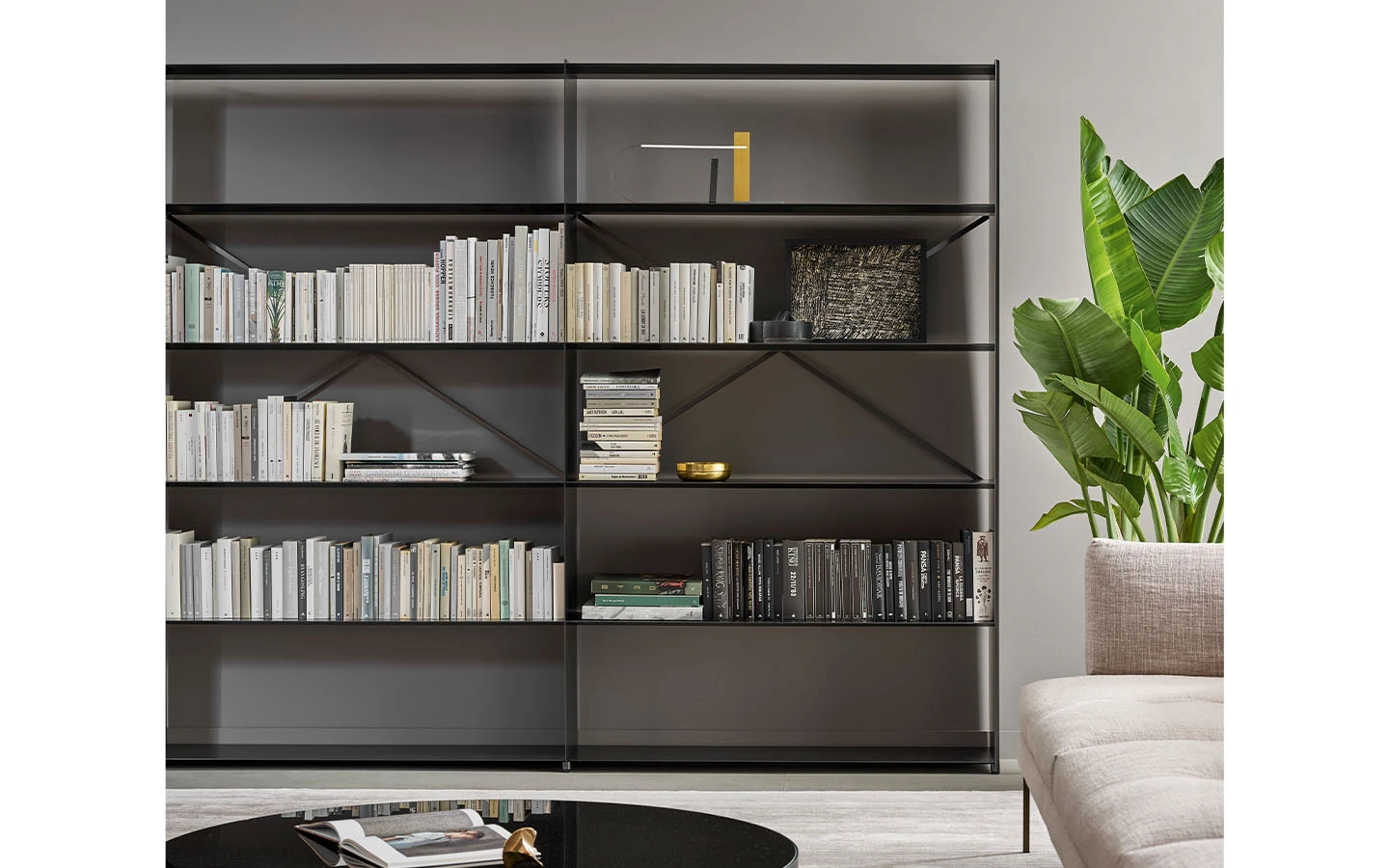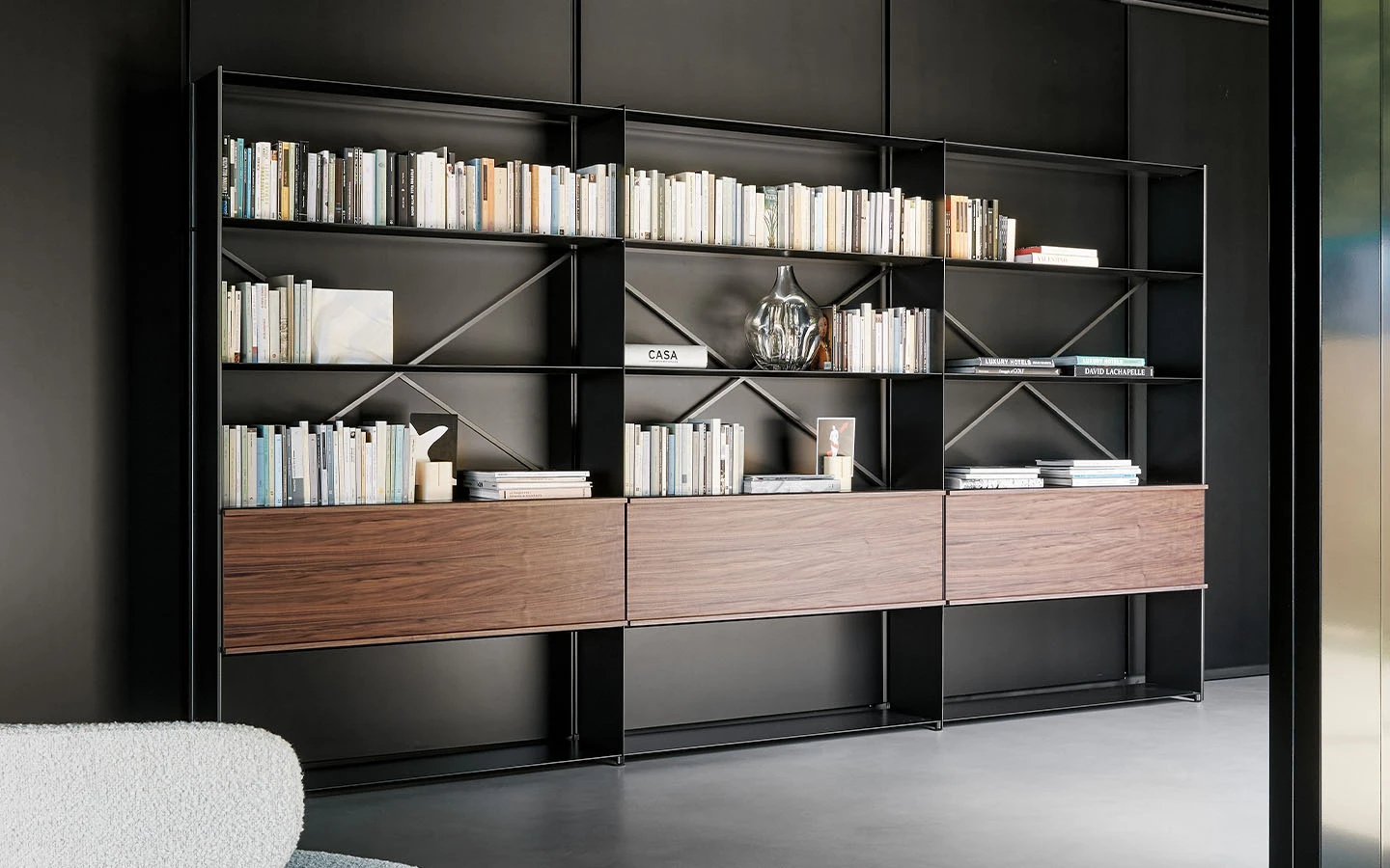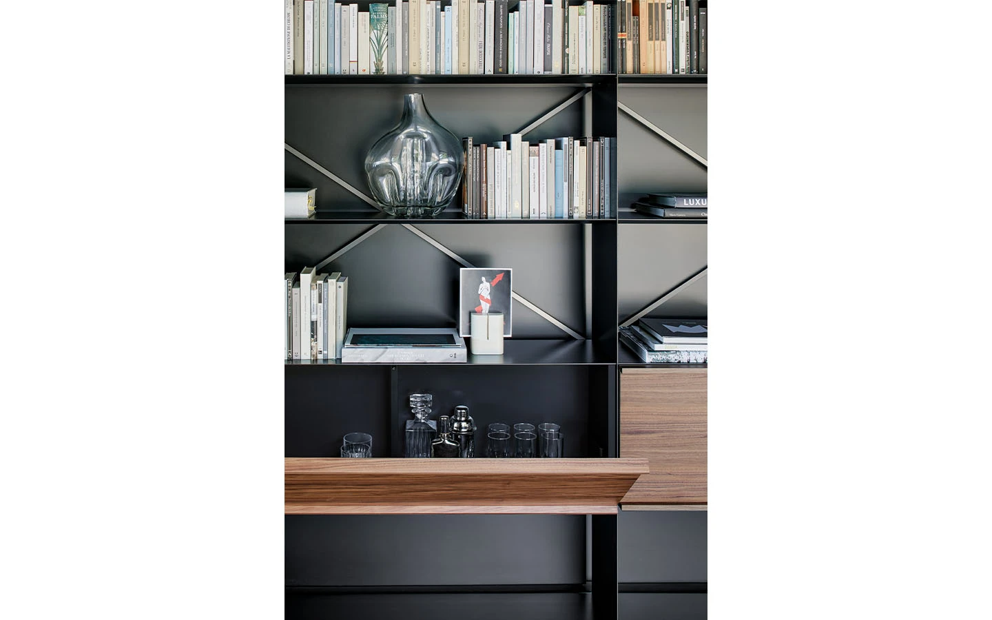 KAOS е серия модулна библиотека от колекцията на италианския производител Bonaldo. Структура и рафтове от метал – финиш по избор на клиента. Опционални шкафове с фронт от естествен фурнир орех Canaletto. Цената на библиотеката се формира на база на избора на размер и финиши.