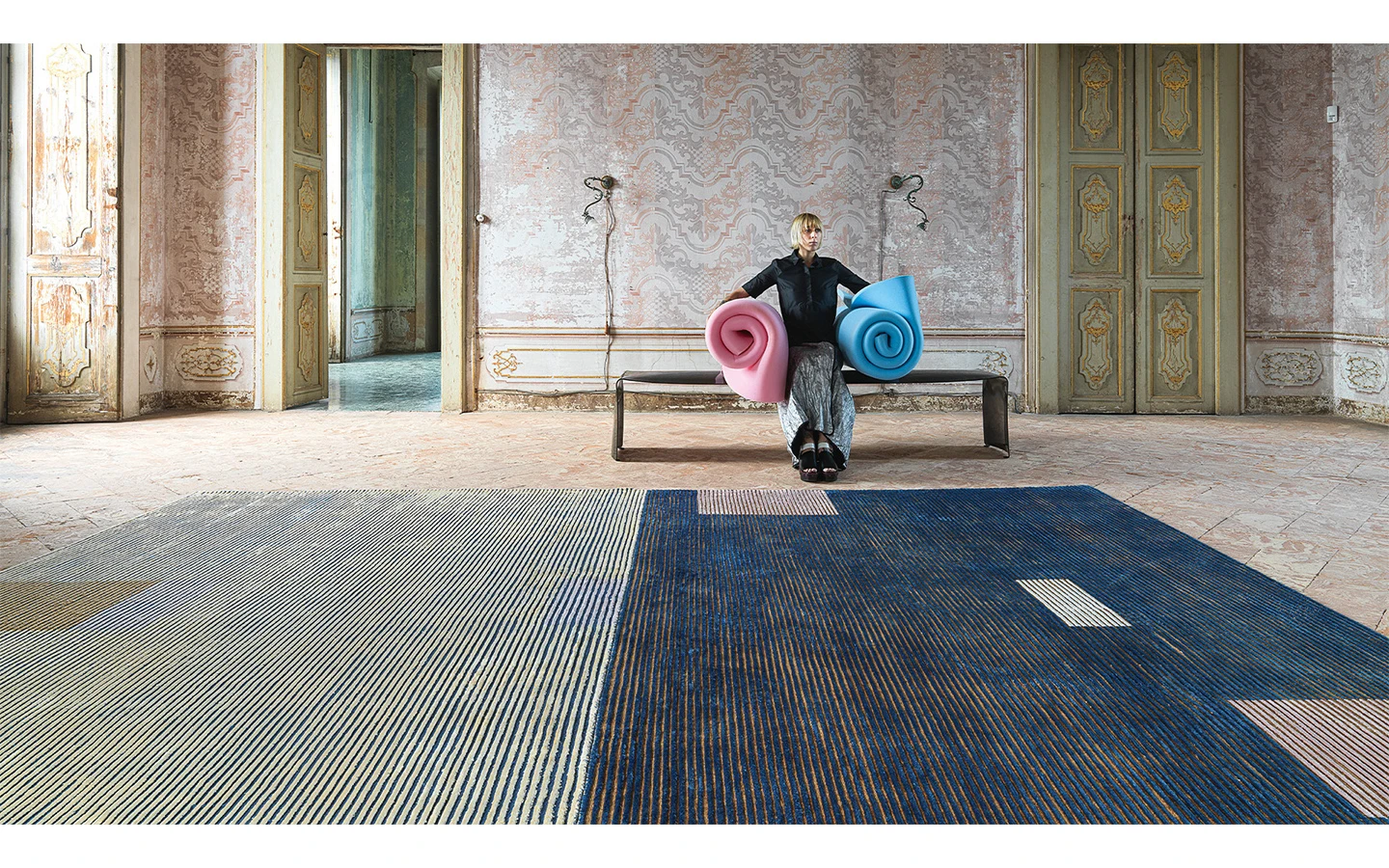 Килимът LINES L4 е част от колекцията LINES на Mohebban Milano, създадена от Mohebban Lab. Тази колекция се характеризира с минималистичен дизайн, включващ ръчно гравирани вертикални линии, прекъсвани от цветни правоъгълници, които добавят декоративен елемент към линейния дизайн. Килимите от тази серия са произведени в Индия чрез техника на ръчно тъкане (hand-loom) с използване на вискоза, което ги прави меки и приятни на допир.