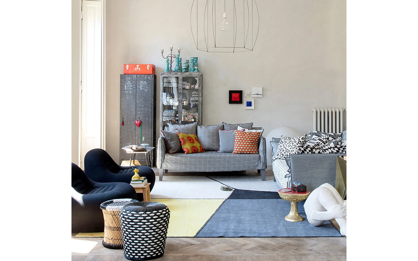 Килимът NOMADISMI SUNSHINE е част от колекцията NOMADISMI на Mohebban Milano, проектирана от Elena Caponi. Тази колекция е изцяло изработена в Турция с рециклирани конопени тъкани. Тези винтидж текстили се преработват чрез повторно багрене и съединяване с вълнена нишка, допълнени с пискюли, за да се създадат уникални килими, богати на цветови и тактилни контрасти. Всеки килим от колекцията е уникален поради естествените вариации в оригиналните рециклирани материали, което гарантира, че няма два еднакви модела. Стандартната дебелина на килимите е приблизително 0.5 см, като могат да бъдат персонализирани по размер и цвят при заявка.