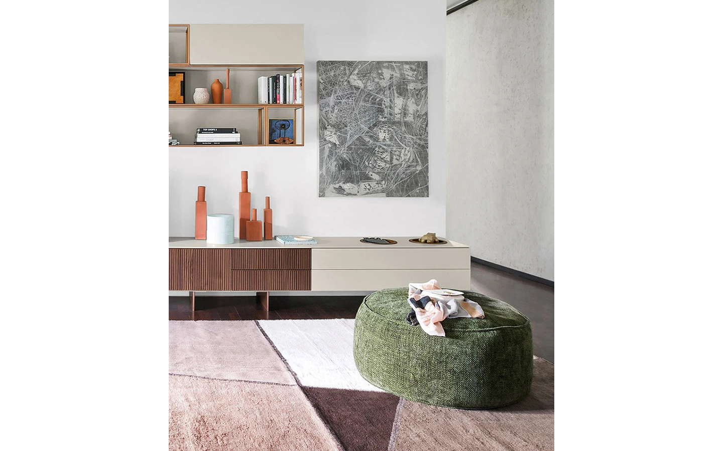 Килимът NOMADISMI TERRE е част от колекцията NOMADISMI на Mohebban Milano, проектирана от Elena Caponi. Тази колекция е изцяло изработена в Турция с рециклирани конопени тъкани. Тези винтидж текстили се преработват чрез повторно багрене и съединяване с вълнена нишка, допълнени с пискюли, за да се създадат уникални килими, богати на цветови и тактилни контрасти. Всеки килим от колекцията е уникален поради естествените вариации в оригиналните рециклирани материали, което гарантира, че няма два еднакви модела. Стандартната дебелина на килимите е приблизително 0.5 см, като могат да бъдат персонализирани по размер и цвят при заявка.