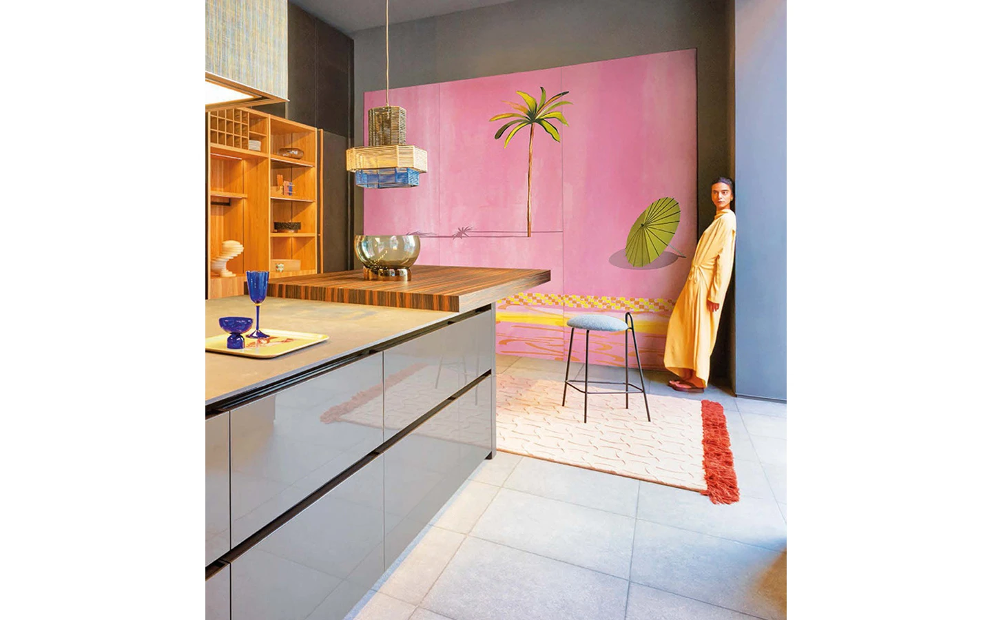 Килимът TWIGGY PINK от Mohebban Milano, проектиран от Serena Confalonieri, е вдъхновен от ярките цветове, шарки и стилове на 70-те години. Този ръчно тъфтиран килим е изработен от 100% вълна и включва тон-в-тон мотиви, постигнати чрез различни височини на влакната. Отличителен елемент в дизайна са контрастните ресни с уникален „стъпаловиден“ разрез, който придава допълнителен обем и мекота на декоративния ефект.