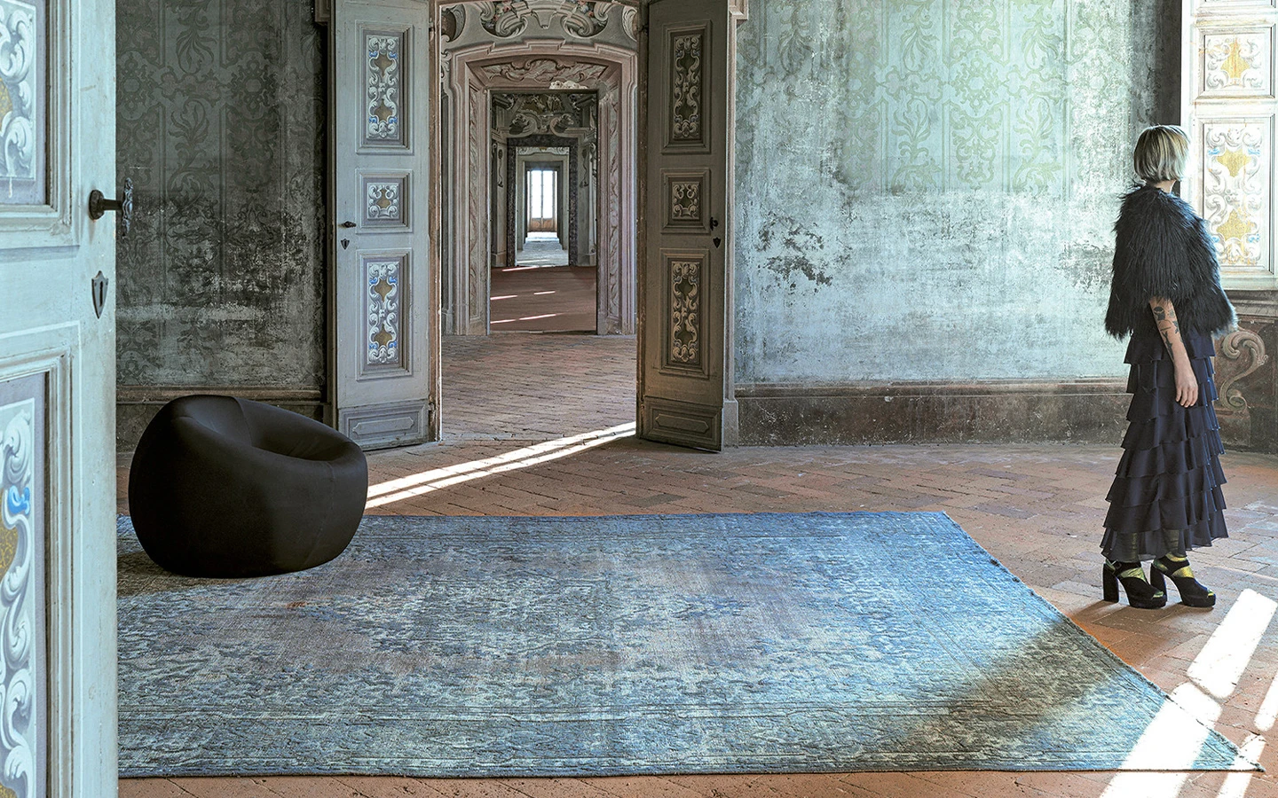 Килимът VINTAGE DARK TURQUOISE от Mohebban Milano е част от колекцията VINTAGE, която трансформира традиционни ръчно вързани килими в модерни дизайнерски произведения. Тези килими преминават през процес на обезцветяване и последващо багрене в монохромни нюанси, което им придава уникален и съвременен вид. Влакната на килима се частично или напълно бръснати, за да се постигне износен, но стилен ефект. Всеки килим от тази колекция е уникален и невъзможен за точно възпроизвеждане.