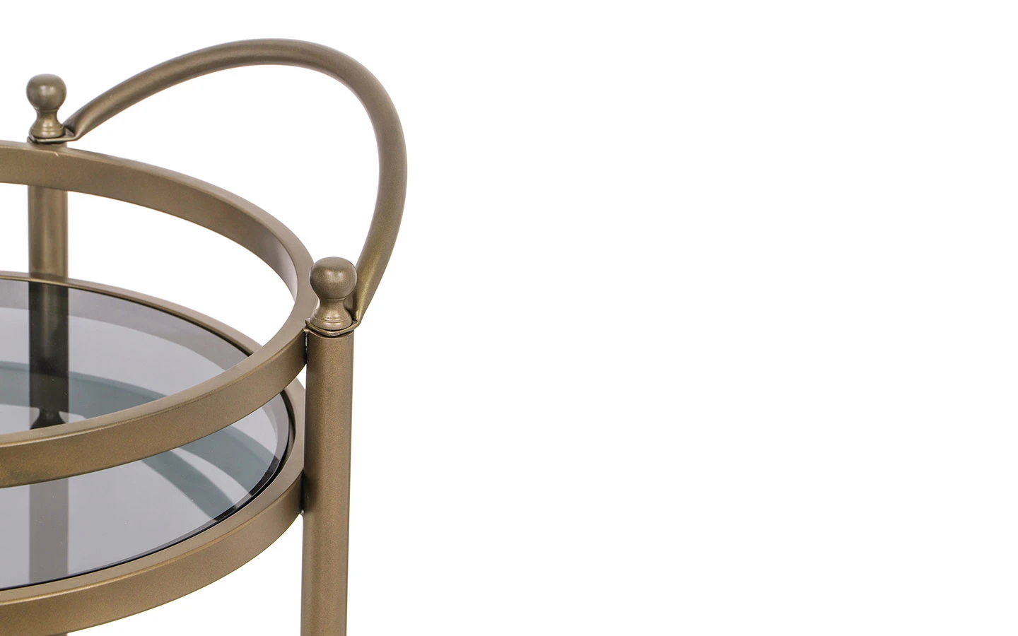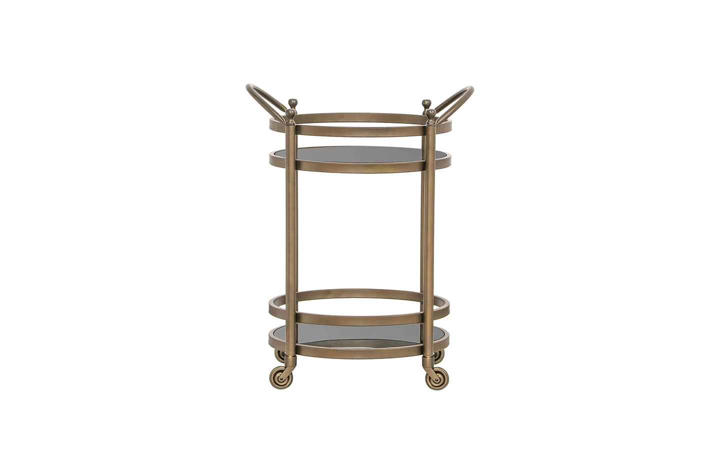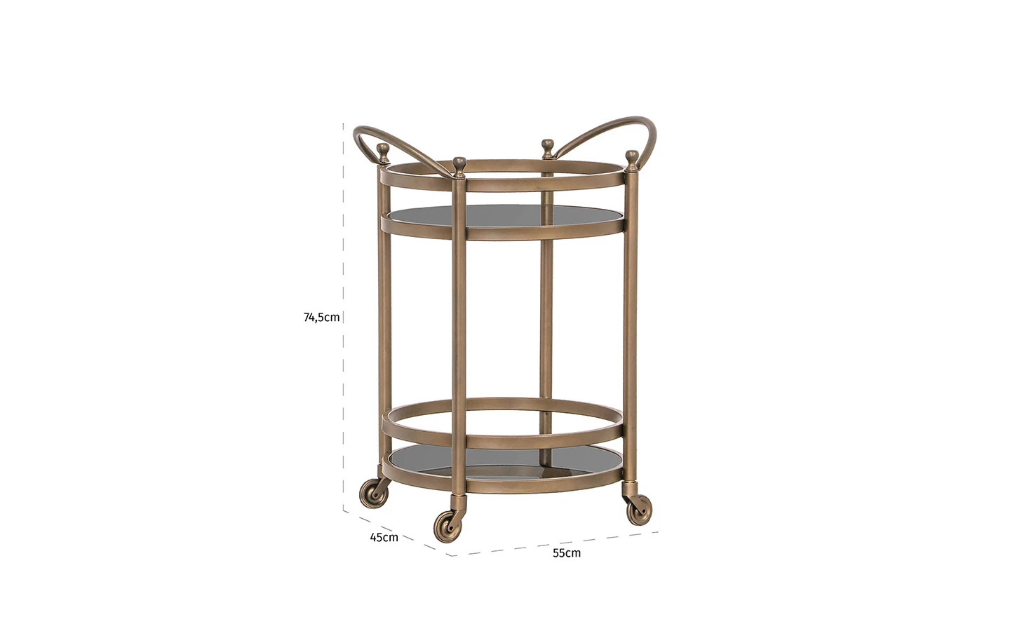 HENDRICKS BRASS от Richmond Interiors е изискана и практична количка за напитки, която впечатлява с елегантния си дизайн и качествена изработка. С кръгла форма, два стъклени рафта и фино покритие в антично злато, тя придава усещане за лукс с ретро вдъхновение. Конструкцията ѝ е изработена от желязо и алуминий в комбинация с закалено стъкло, което я прави едновременно здрава и стилна. Оборудвана е с удобни дръжки и колелца за лесно придвижване, което я прави идеална както за сервиране на напитки, така и като декоративен акцент във всекидневната или трапезарията.