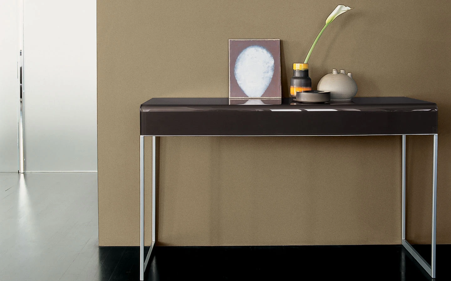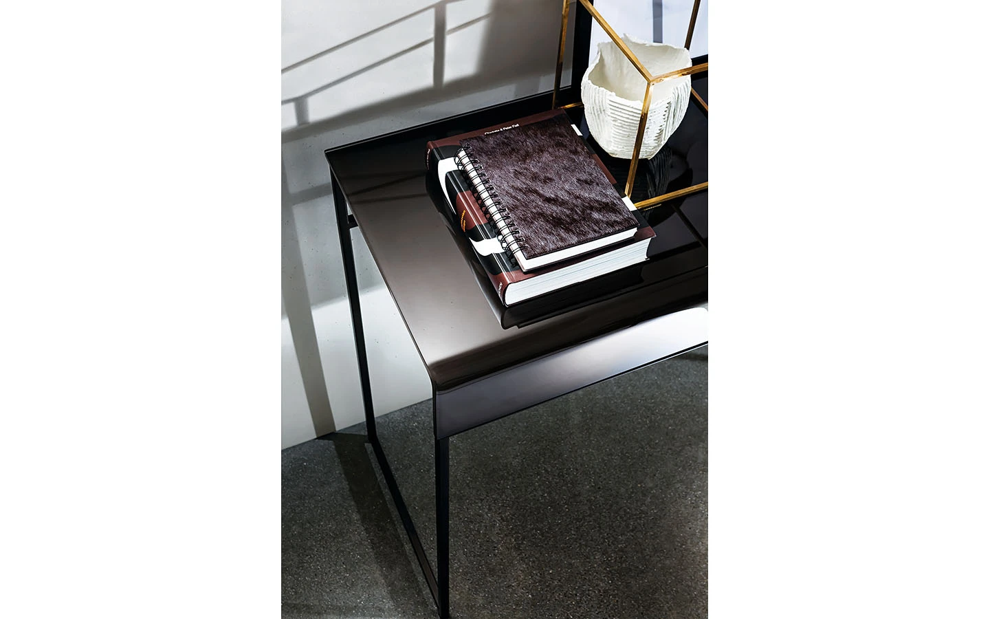 Извитото стъкло и металеният профил са комбинирани, за да създадат единна форма, способна да генерира различни цветови комбинации и типове мебели: от маси за кафе до конзоли. Идея, която може да задоволи различни нужди с уникален стил за интериори както в дома, така и в търговски пространства. Конзолата NIDO разполага с метална структура, налична в различни покрития, и плот от извито стъкло в различни цветове. Тази комбинация предлага елегантно и модерно решение, което може да се впише в разнообразие от интериорни стилове.