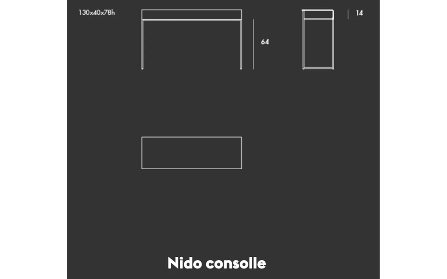 NIDO е италианска конзолна маса от колекцията на италианския производител Sovet. Структурата на масата е изработена от метал – финиш по избор на клиента. Плотът е изработен от извито стъкло – цвят по избор. Цената на конзолната маса се формира на база на избора на финиш на стъклото.