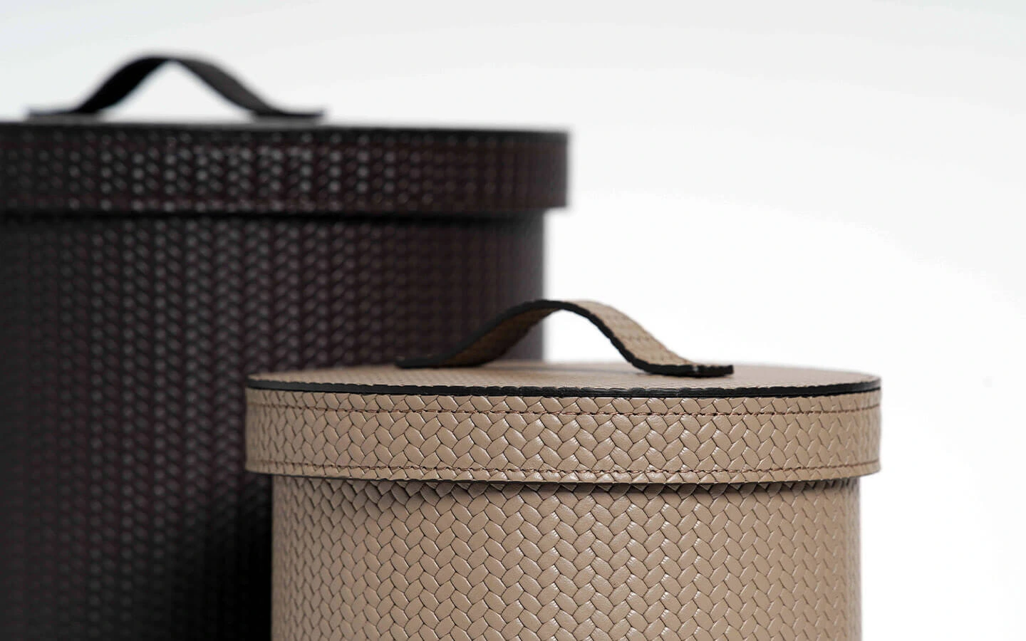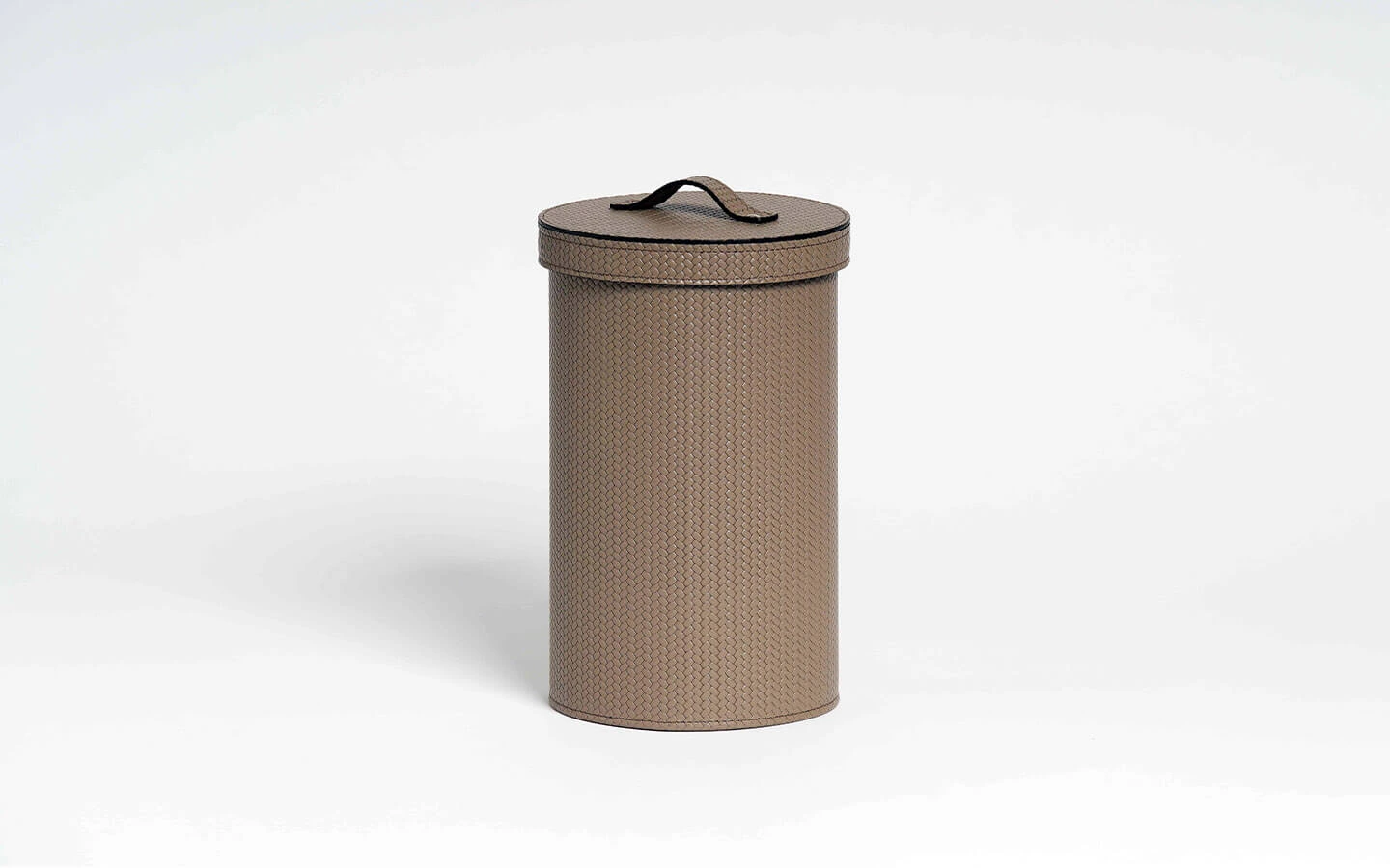 Кошчето за хартия MEDIUM ROUND е със стилна цилиндрична форма и се отличава с висококачествена кожа като външно покритие, което придава изискан акцент на интериора. Изработено е по поръчка в Италия, с внимателно изтъкан кожен мотив. Кошчето се предлага в различни варианти кожа и цветови тоналности, като може да се персонализира според интериорния стил.