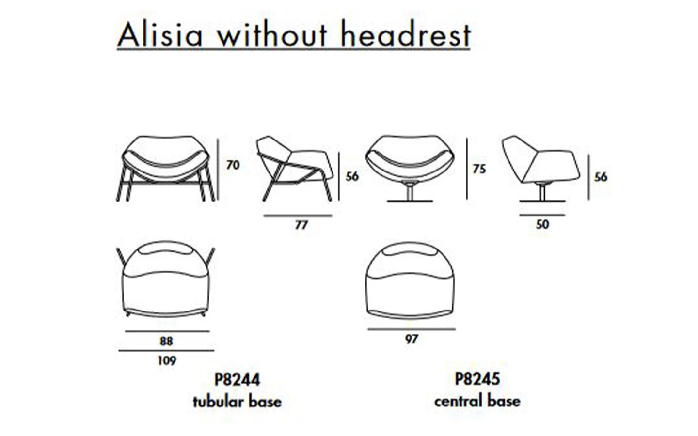 ALISIA е италианско кресло от колекцията на италианския производител Sovet. Креслото ALISIA може да бъде тапицирано в дамаска, еко кожа или кожа – материал и цвят по избор на клиента. Основата на креслото се предлага в два варианта: метални крака или въртяща се метална основа – финиш по избор на клиента. Цената на креслото се формира на база на избора на вид тапицерия.