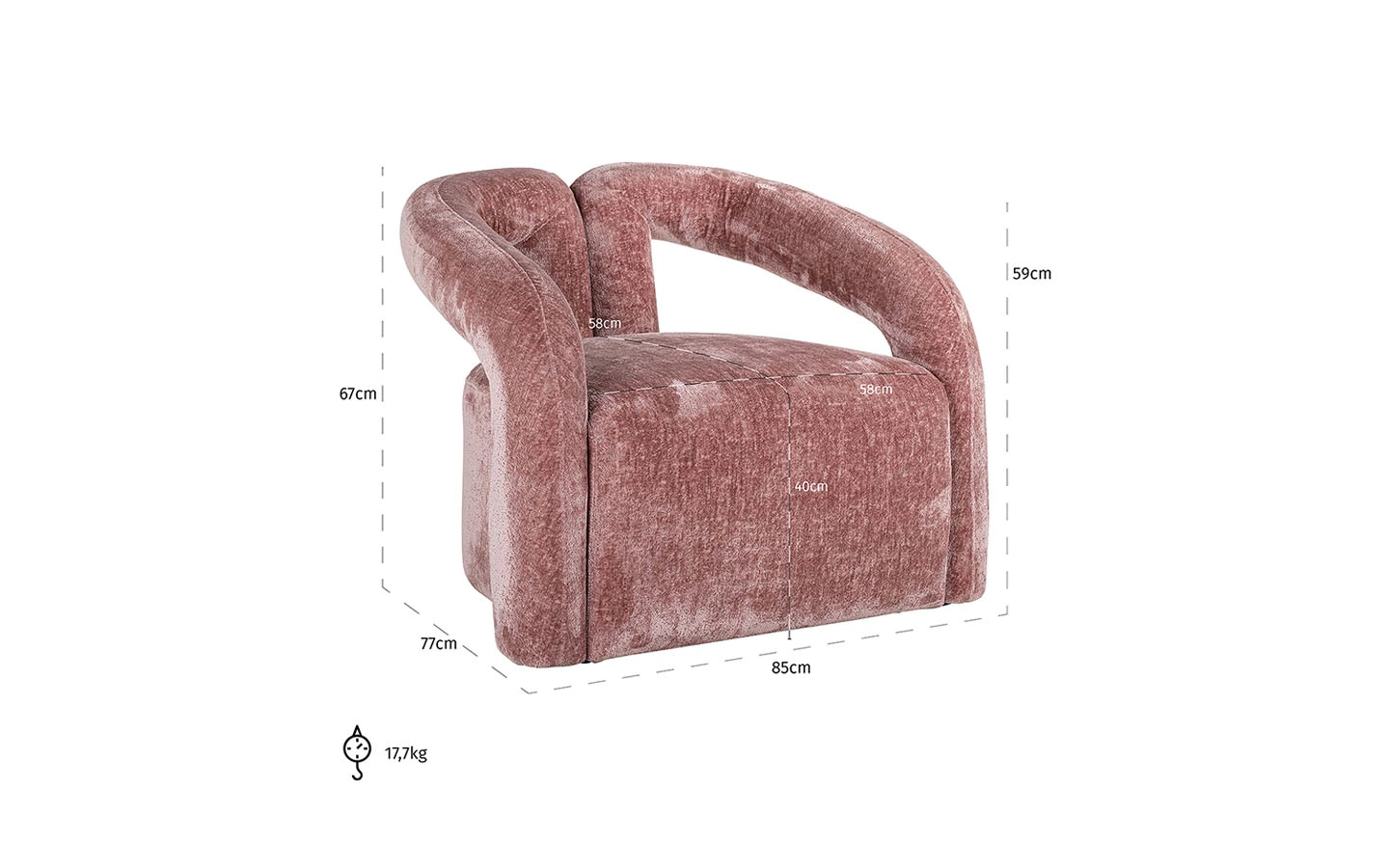 Креслото DANA ROSE на Richmond Interiors е изтънчено и уютно предложение, което носи усещане за нежност и елегантност. Със своя широк и нисък силует, то създава усещане за отвореност и покана към пълен релакс. Меката и плътна шенилна материя в нежен розов нюанс придава топлина и визуален комфорт, а изчистените линии и стабилната основа допълват модерната му визия. Креслото е идеално както за всекидневна или спалня, така и за стилна зона за изчакване, където се търси съчетание между финес и удобство. DANA е избор за интериори с внимание към детайла – място, в което комфортът има изразителна форма.