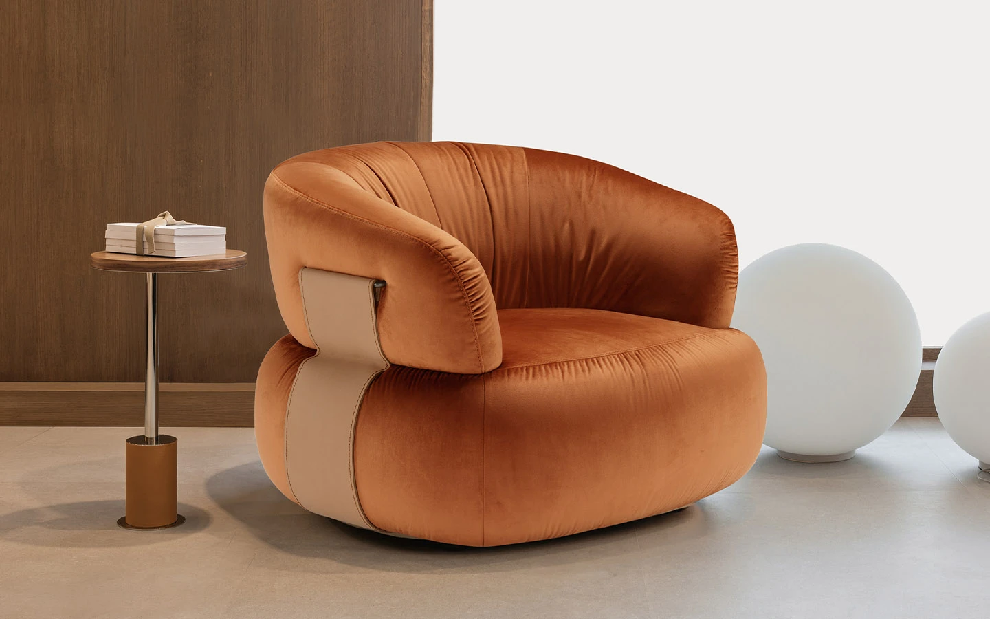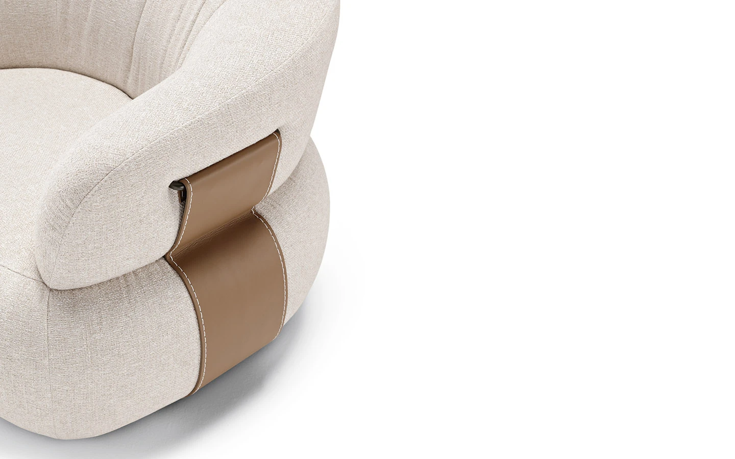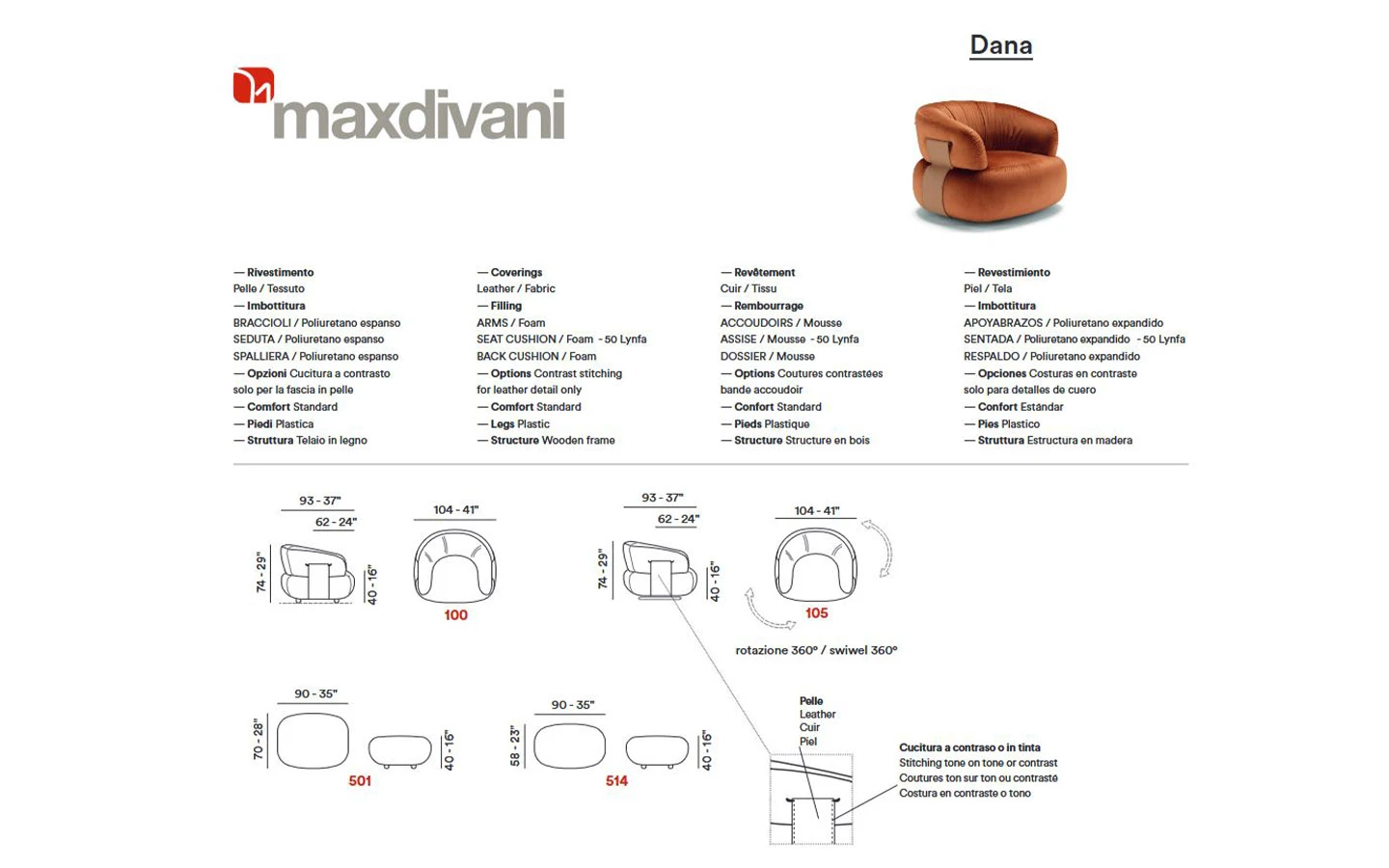 Креслото DANA от Max Divani се отличава с меки контури, съчетаващи изтънчено майсторство с изключителен комфорт. Здравият и щедро заоблен дизайн е обогатен с детайли като изискани кожени ленти, пришити от двете страни, които свързват седалката с облегалката. Тези спецификации гарантират, че креслото DANA съчетава естетика с функционалност, предлагайки стилно и комфортно допълнение към всеки интериор.