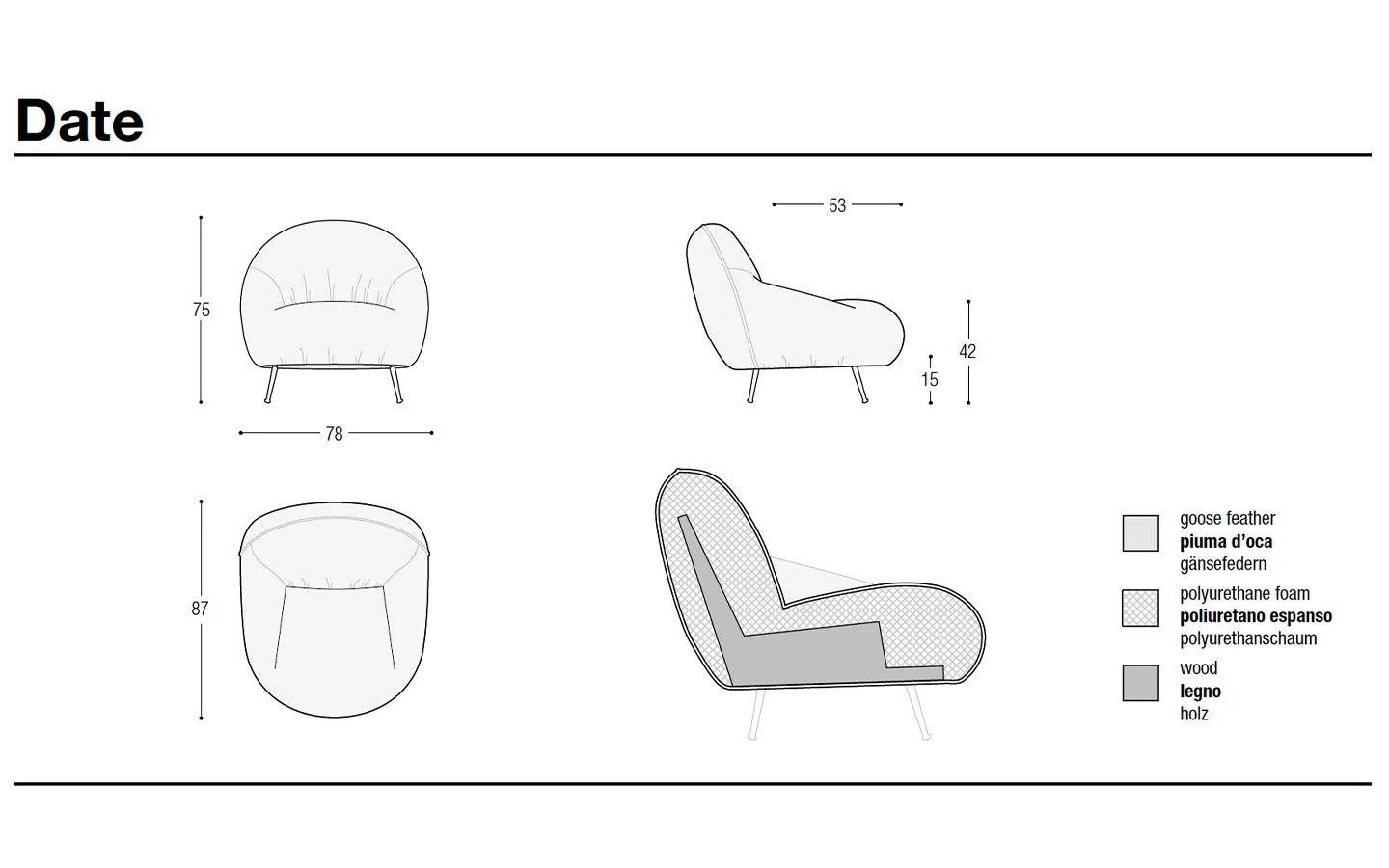 Кресло DATE от Flexteam е съвременна мебел, проектирана да осигурява комфорт и естетическа привлекателност. Креслото съчетава модерна елегантност с функционалност, характеризира се с чисти линии и стилен силует, което го прави подходящо за различни интериорни стилове. Структурата на креслото е изработена от масивно дърво. DATE предлага акцент на комфорта, с меки възглавници с пълнеж от полиуретанова пяна в различна плътност, които канят към релаксация. То е проектирано да осигурява уютно седене. Кресло DATE се вписва безпроблемно в хола, салони или офис пространства, което го прави универсален избор както за дом, така и за професионална среда.