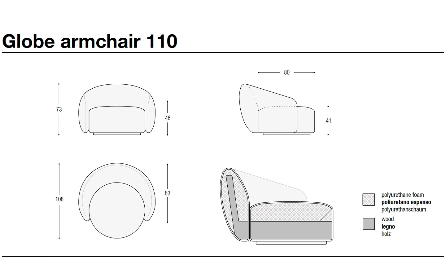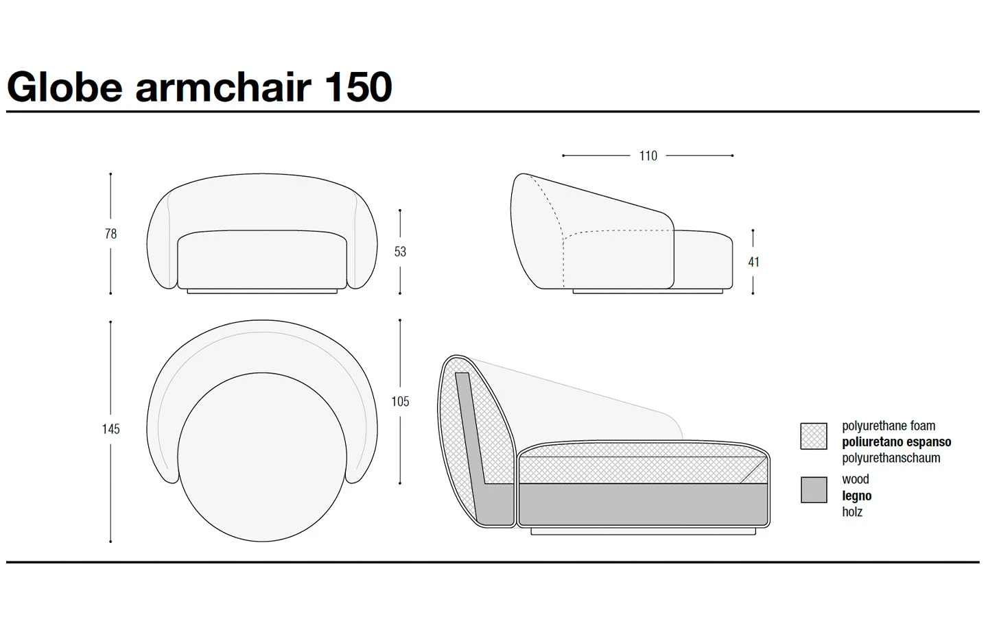 GLOBE ARMCHAIR е италианско кресло от колекцията на италианския производител Flexteam. Италианското кресло GLOBE ARMCHAIR може да бъде тапицирано в дамаска или еко кожа – материал и цвят по избор на клиента. Основата на креслото се предлага във фиксирана и въртяща се версия. Креслото GLOBE ARMCHAIR се предлага в два размера. Цената на креслото се формира на база избора на размер и вид тапицерия.