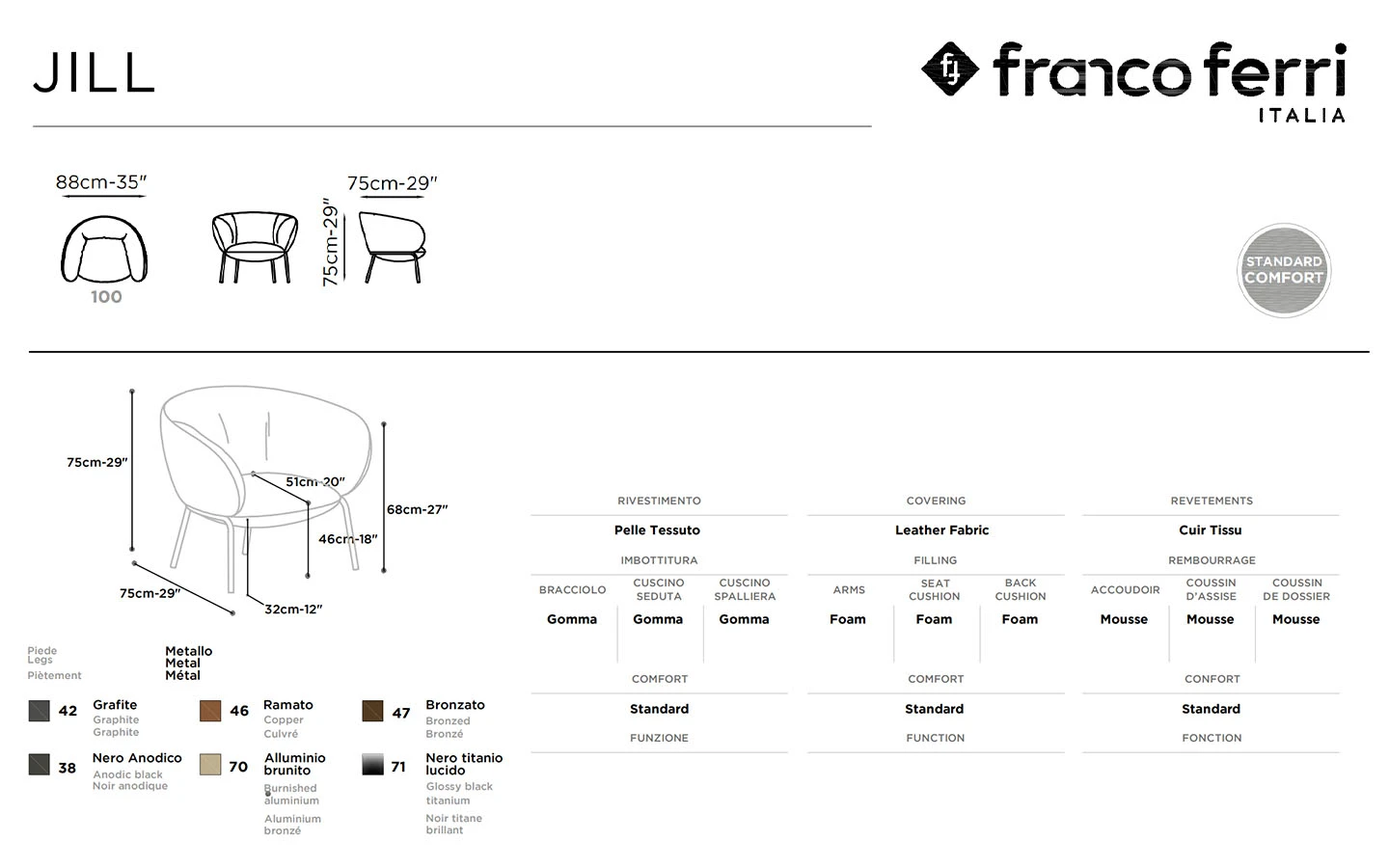 Креслото JILL се отличава с безупречното си сливане на прецизност и елегантност благодарение на обгръщащата си форма, която осигурява ергономична поддръжка. Неговата стабилност е гарантирана от тънките метални крака, които допълват отличителния му вид. JILL се представя като икона на съвременния стил и комфорт, перфектна за обогатяване на всяка среда с докосване на клас и изисканост.