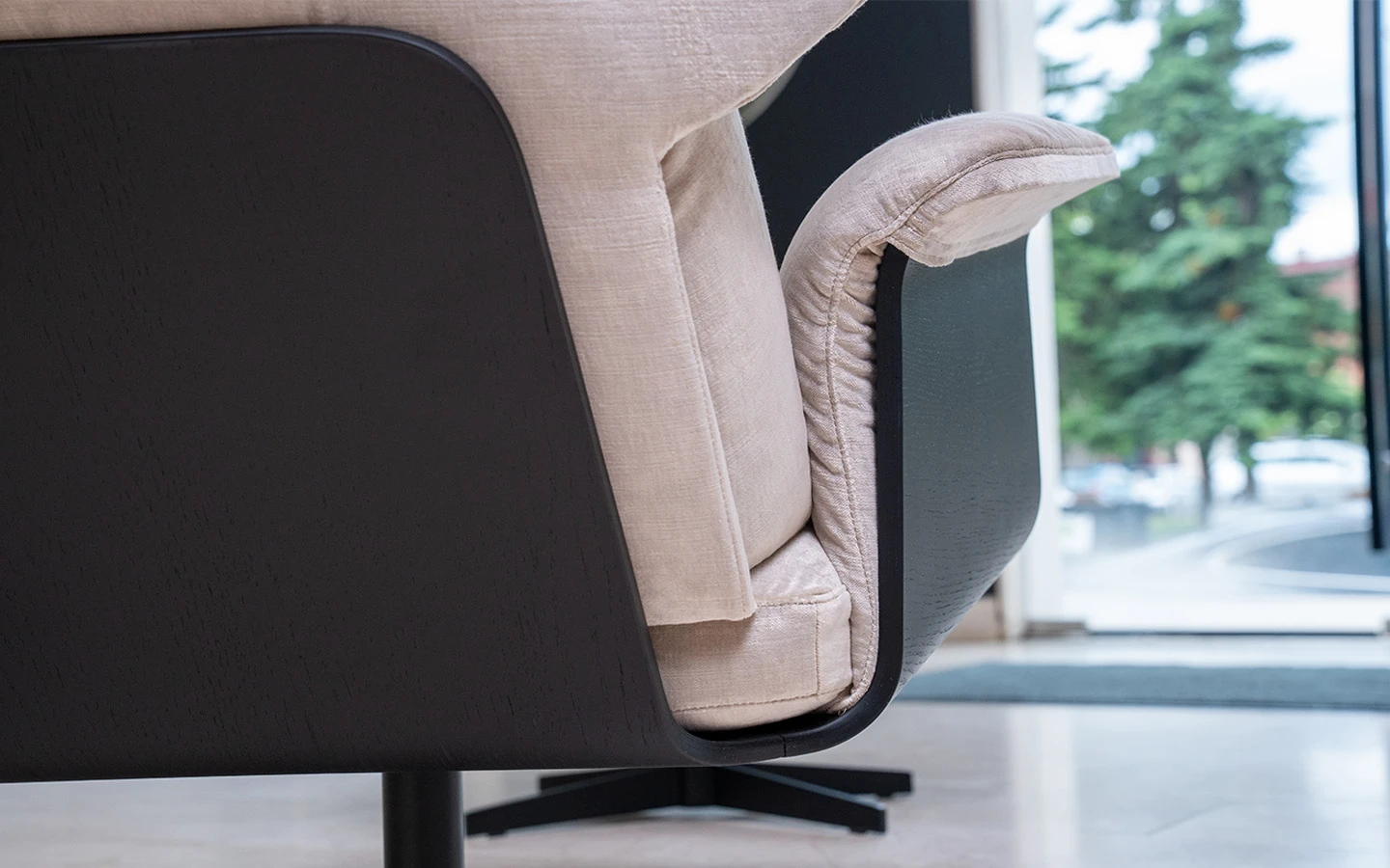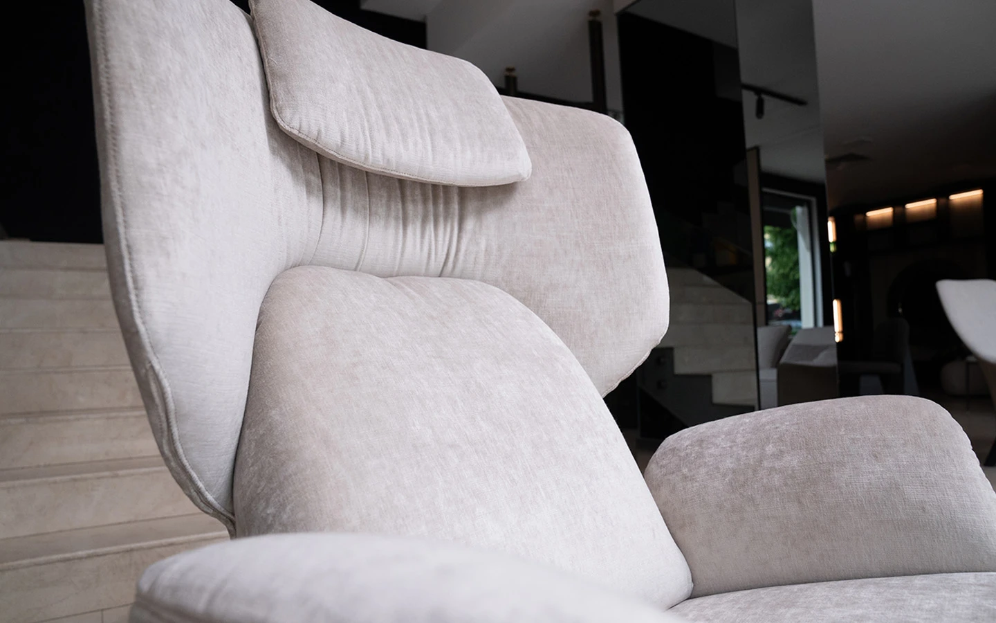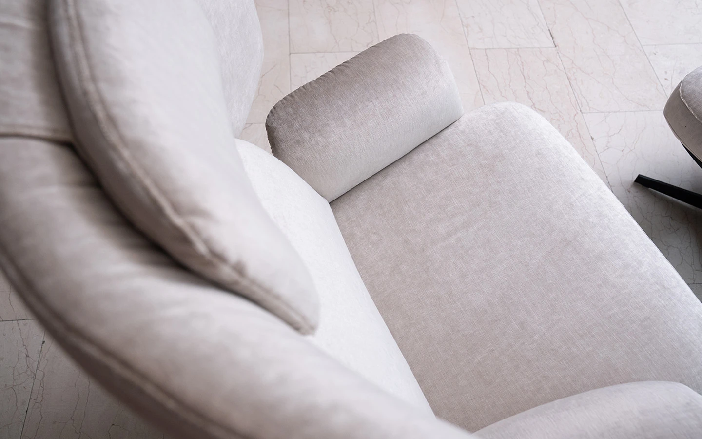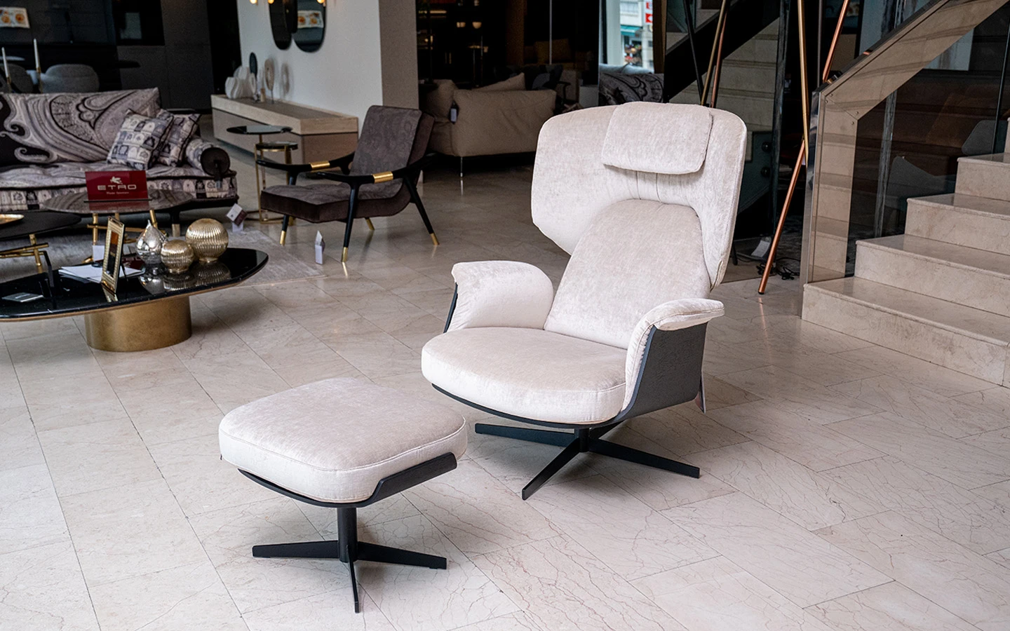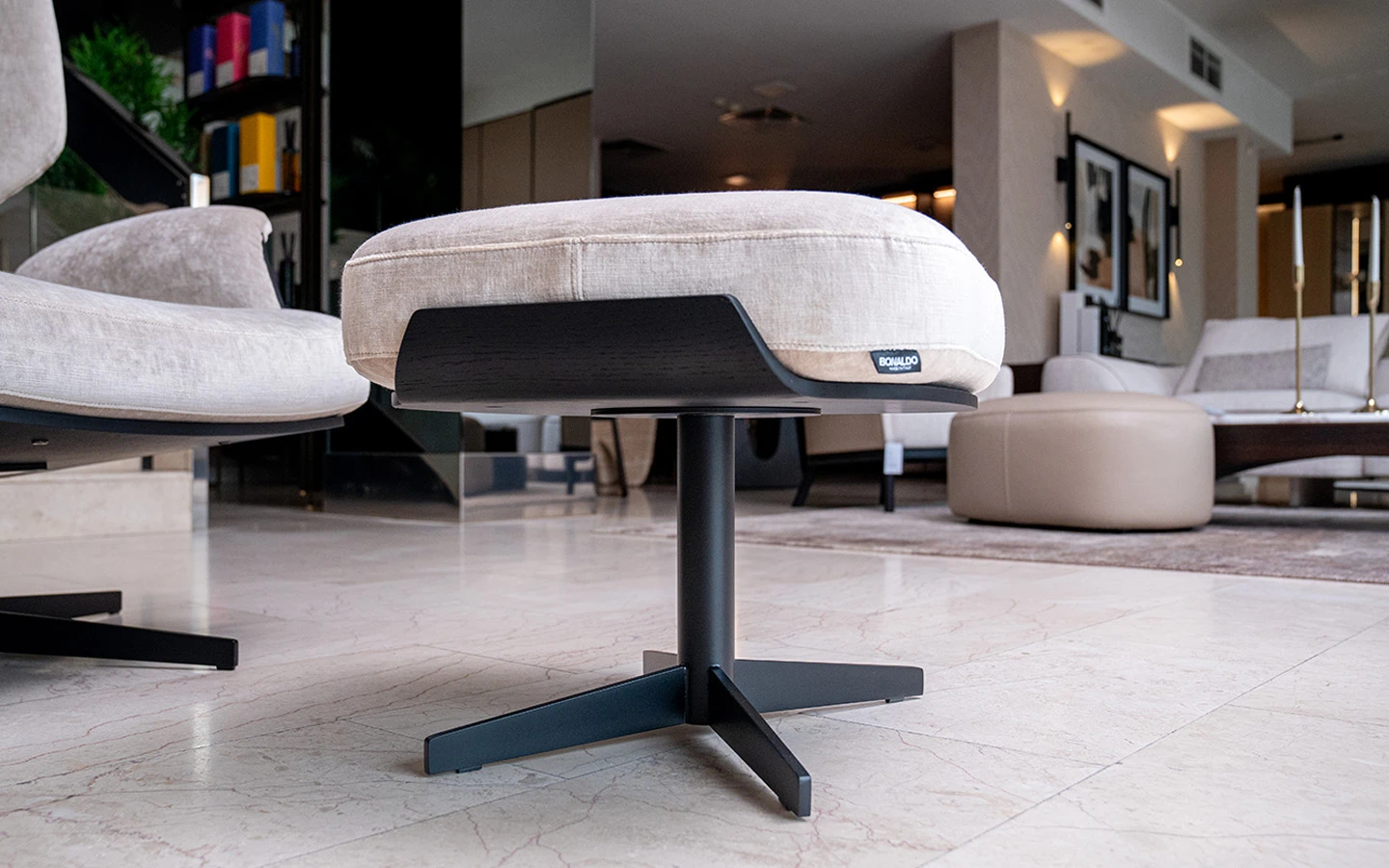 Кресло с табуретка OLOS BERGÈRE от италианския производител Bonaldo. Креслото и табуретката са тапицирани в плюш – цвят бял. Структурата е изработена от фурнировано дърво – финиш Coal Oak. Основата на креслото е въртяща се и е изработена от метал – финиш Black.