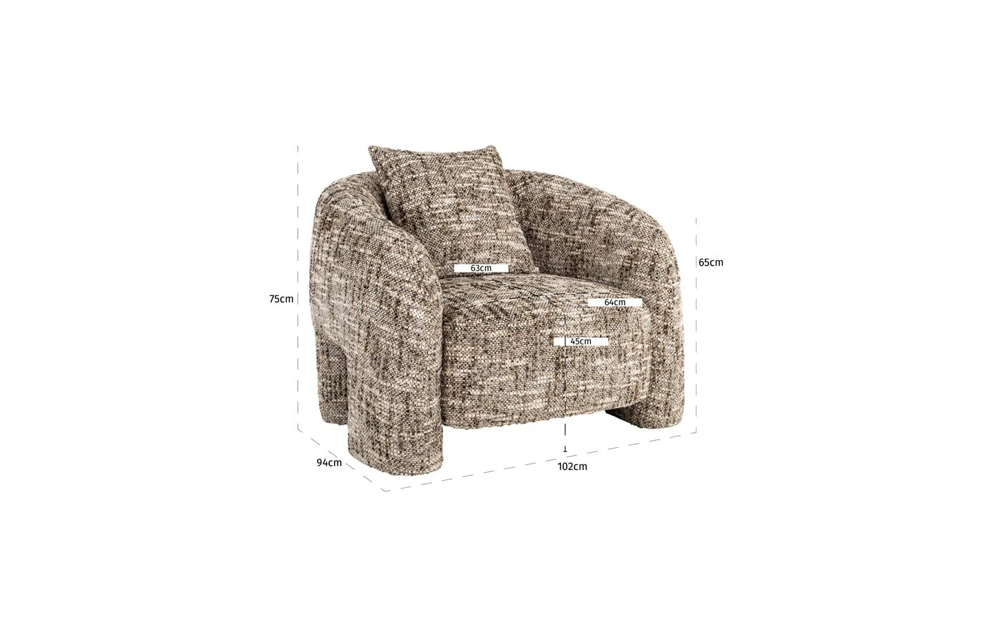 Кресло TUSCANY BROWN OMARA от Richmond Interiors е изключително стилно и комфортно кресло, което добавя топлина и елегантност във всяко съвременно жилище. Изработено е с висококачествена тапицерия от 100% полиестер в топъл кафяв нюанс, който лесно се съчетава с различни интериорни стилове и цветови гами. Креслото има удобна и ергономична форма с органични линии, осигуряващи максимален комфорт при сядане, а здравата конструкция гарантира дълготрайност и стабилност. С размери, подходящи за всяко помещение, това кресло е отличен избор както за хол, така и за трапезария или домашен офис, придавайки уют и изисканост на вашето пространство.