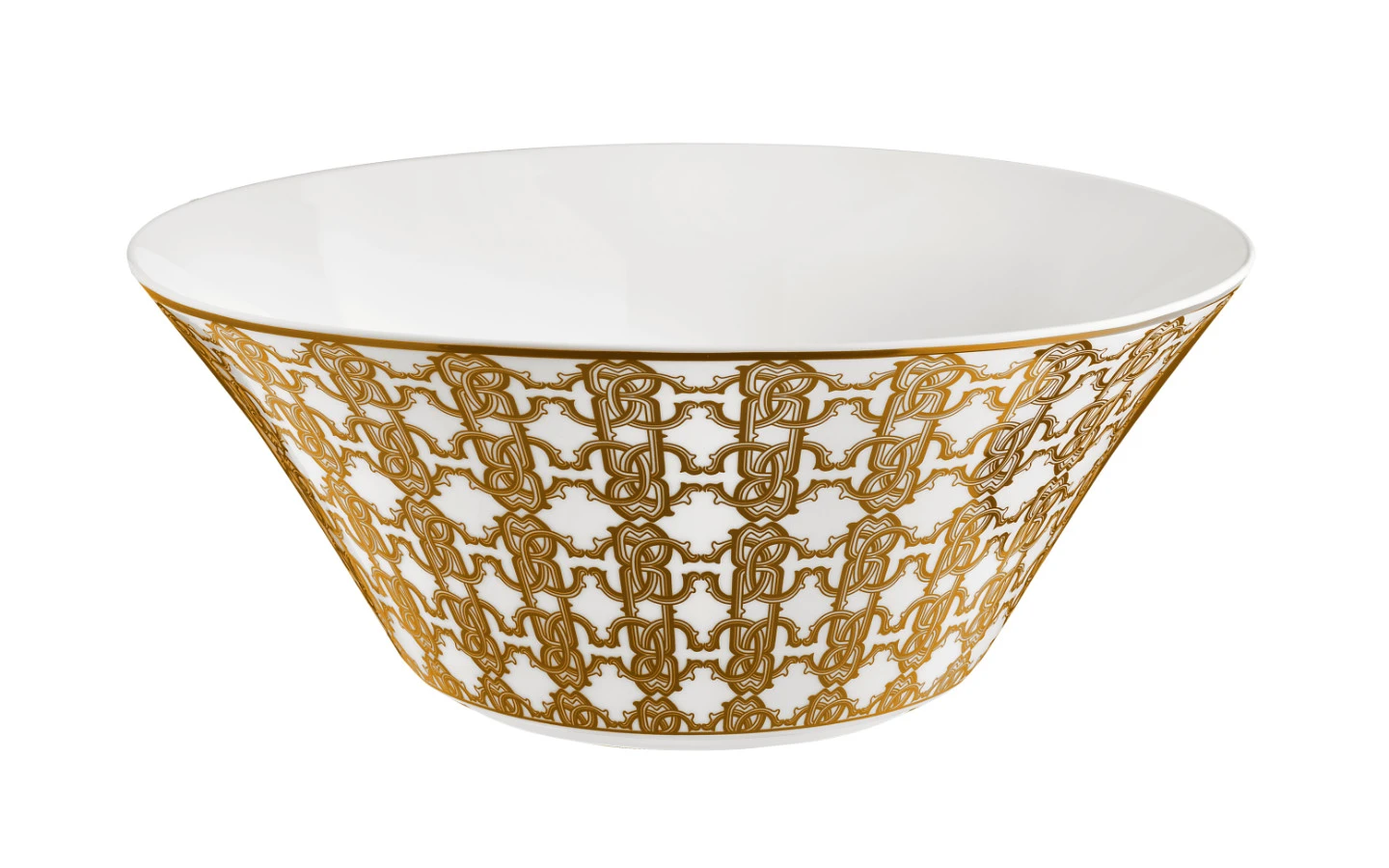 Купа за салата от колекцията Monogram Gold от Roberto Cavalli Home. Зашеметяващият монограм на Roberto Cavalli украсява красивия бял костен порцелан в целия му блясък.