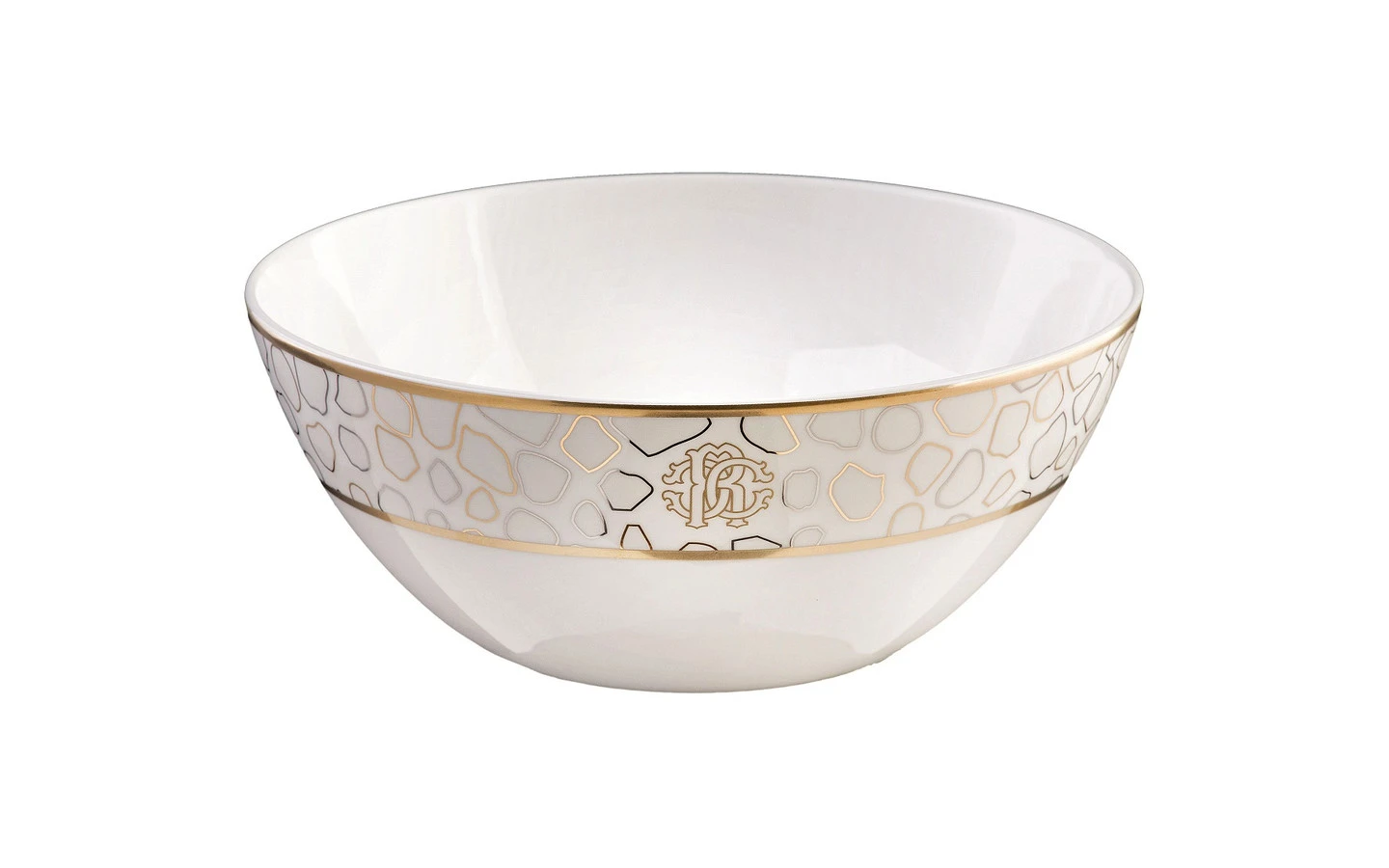 Купа за супа от колекцията Giraffa от Roberto Cavalli Home. Зашеметяващият дизайн на Giraffa е върху красив бял костен порцелан и е с дизайн от златни и платинени фигури, златен кант и деликатно поставено лого на Roberto Cavalli.