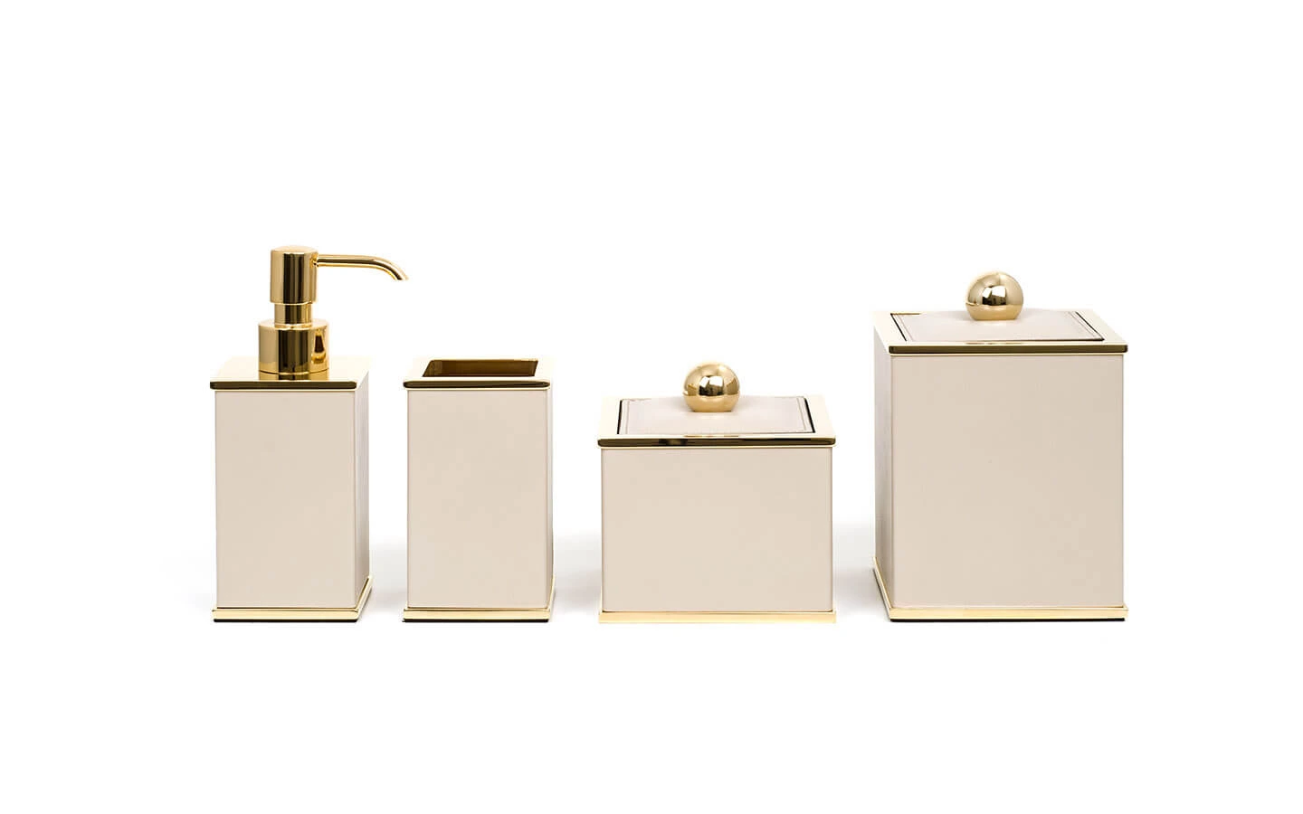 Кутията OLIMPIA SQUARE GOLD LARGE на Pinetti е луксозен квадратен контейнер, който впечатлява с елегантен дизайн и характерен златист финиш. Кутията е покрита с висококачествена естествена кожа, създаваща фин тактилен контраст, а металните детайли и дръжката – изпълнени в златен финиш – оформят цялостна, премиум естетика. Благодарение на големия си размер моделът предлага удобно съхранение на по-обемни аксесоари, декоративни предмети или лични вещи, като едновременно служи и като стилен акцент върху маса, конзола или рафт. Кутията е част от колекцията OLIMPIA, предлага се в различни кожени текстури и цветови варианти, а всяко изделие се изработва ръчно в Италия.