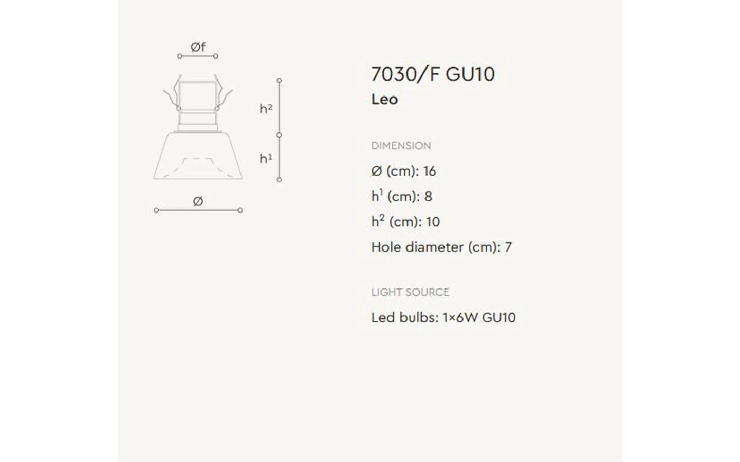 Луната LEO на ITALAMP впечатлява с елегантна форма и изчистено присъствие, вдъхновени от съзвездието Лъв. Изработена от стъкло с металически отблясъци, тя се предлага в три изискани финиша – злато, титаниево и бяло с ефирен отблясък. Компактна и дискретна, с диаметър 15 см и височина 8 см, луната е подходяща за вграждане с монтажна дълбочина около 7 см. Работи с една LED крушка, осигуряваща високо ниво на цветопредаване (CRI >80), като предлага възможност за димиране чрез TRIAC. Дизайнът е създаден от Danilo De Rossi и е част от колекцията Generale. Произведена в Италия, LEO е перфектен избор за модерни интериори, в които светлината е не само функционален, но и естетически елемент.
