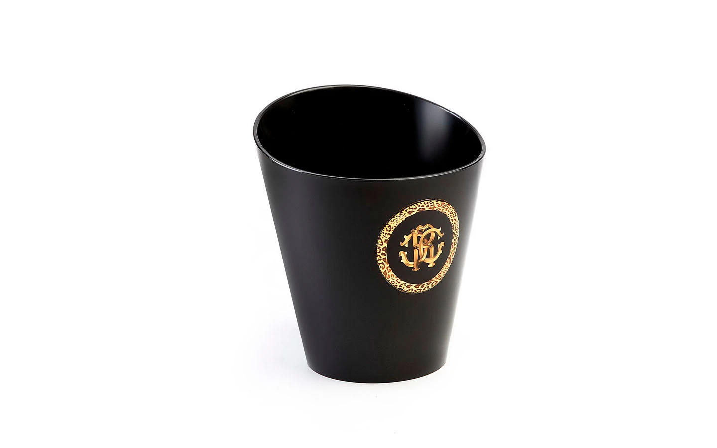 Малка ледарка от колекцията Monogramma Black на Roberto Cavalli Home Luxury Tableware. Дизайнът съчетава стилен златен монограм върху черно акрилно стъкло.