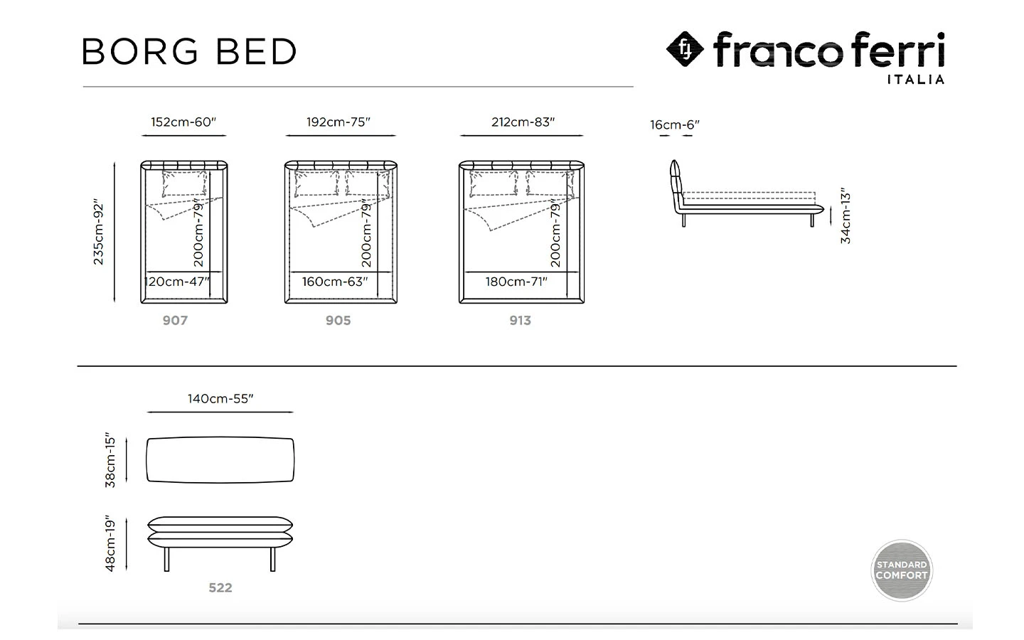 BORG е легло от колекцията на италианския производител Franco Ferri. Италианското легло BORG може да бъде тапицирано в дамаска, кожа или еко кожа – материал и цвят по избор на клиента. Краката не леглото са изработени от прозрачен плексиглас. Цената на леглото се формира на база на избора на вид тапицерия и размер на матрака.