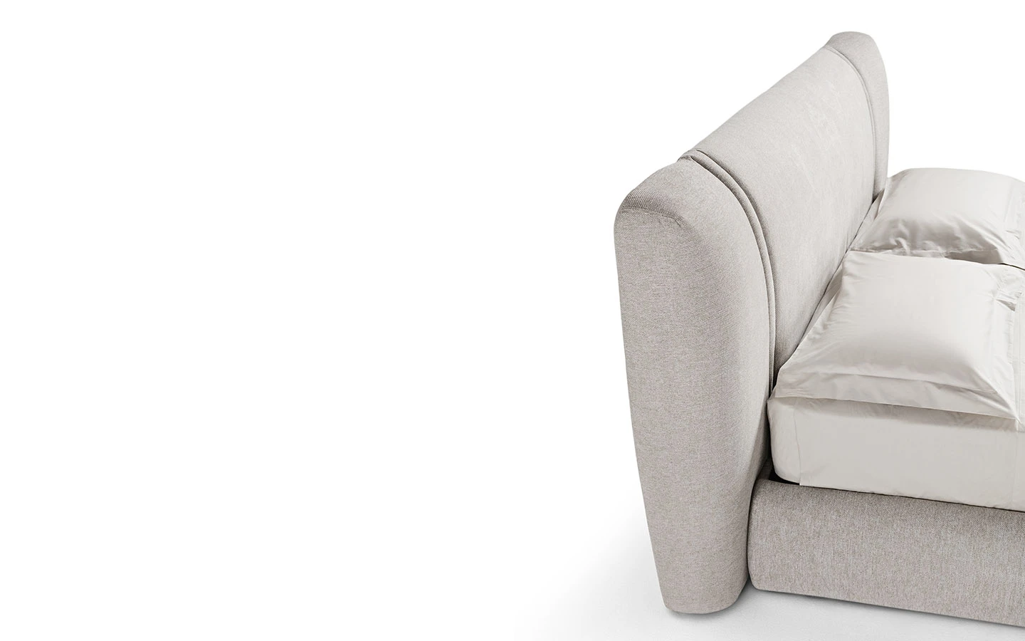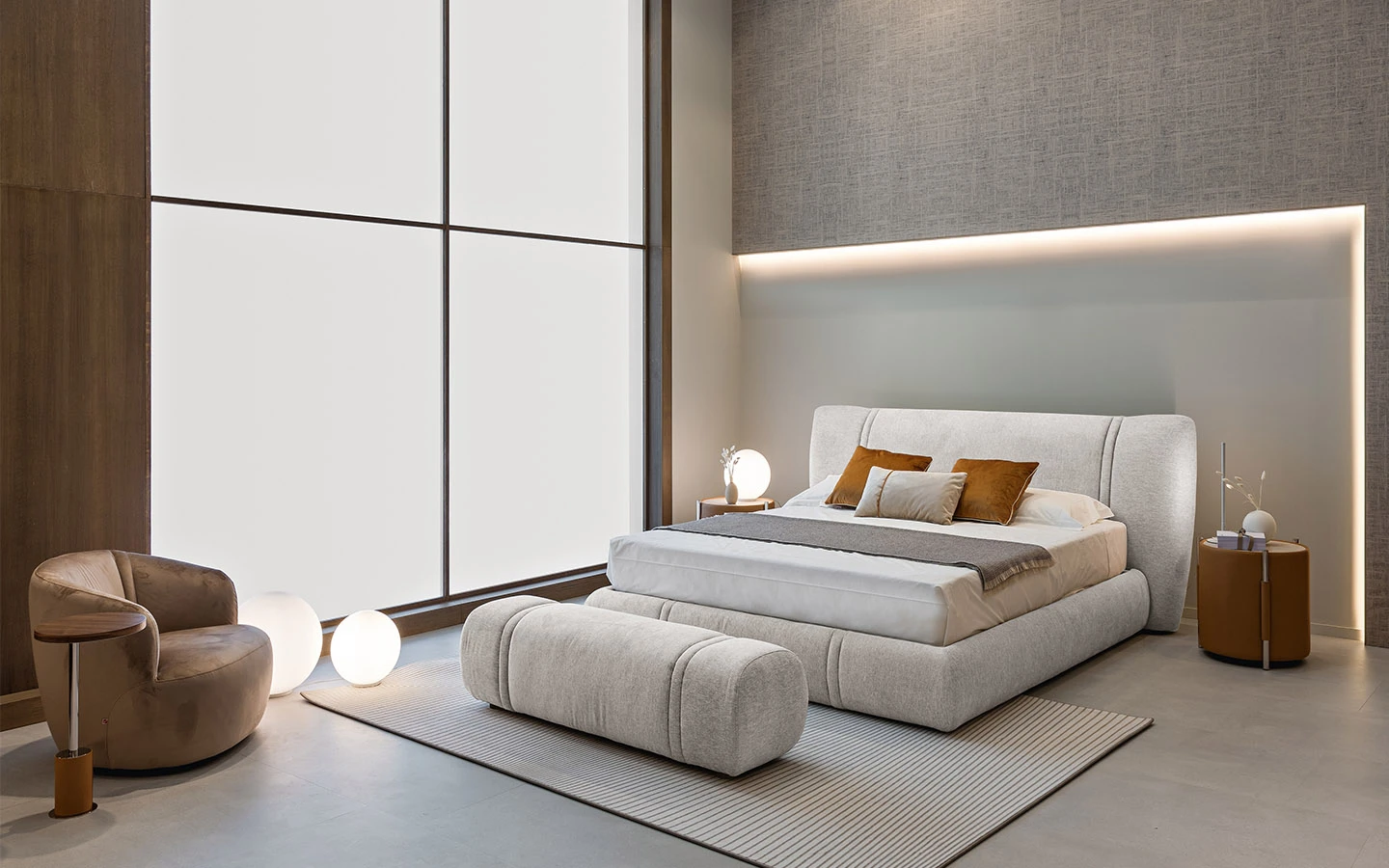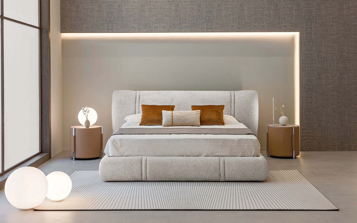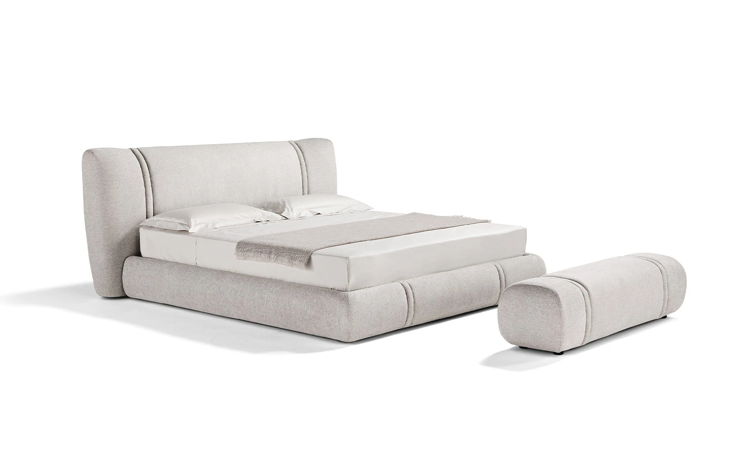 Леглото EMBER от Max Divani се характеризира с тапицирана табла и персонализирани шевове, които създават движение и подчертават контурите му. Рамката на леглото може да бъде оборудвана с механизъм с контейнер за съхранение, осигурявайки допълнително пространство.