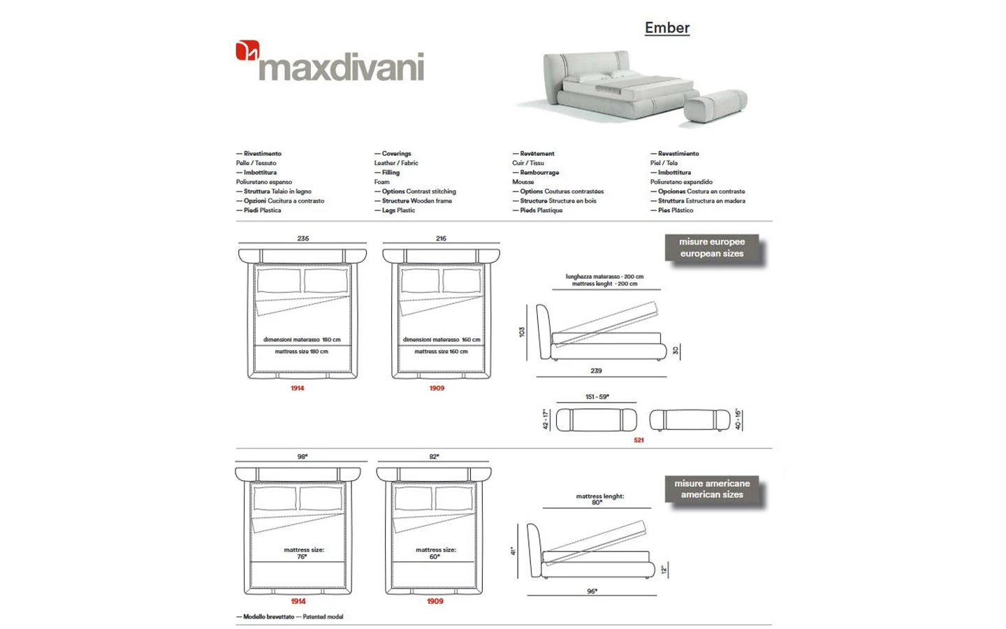 EMBER е легло от колекцията на италианския производител Max Divani. Италианското легло EMBER може да бъде тапицирано в дамаска, еко кожа или кожа – материал и цвят по избор на клиента. Цената на леглото се формира на база на избора на тапицерия и размер на матрака.