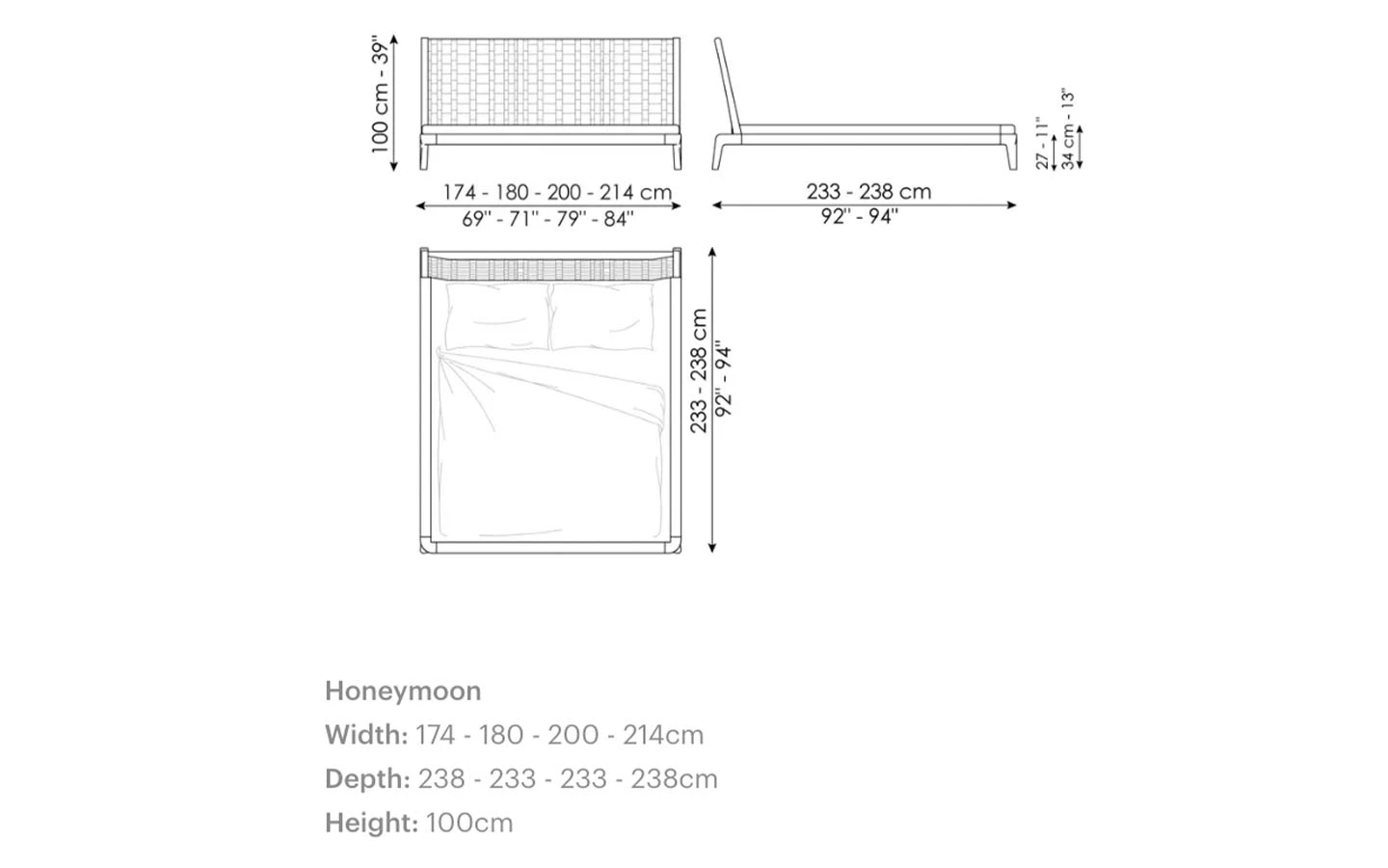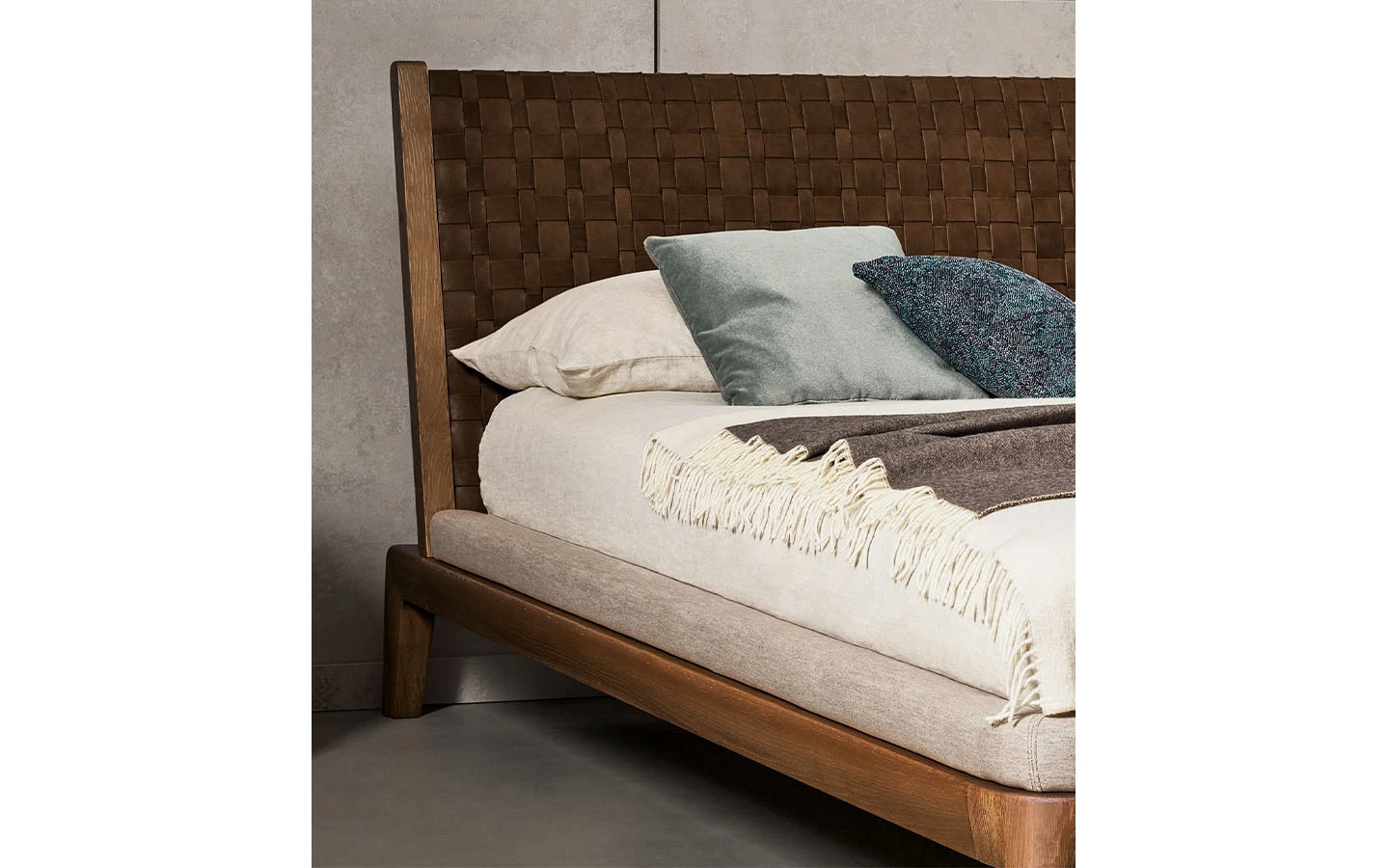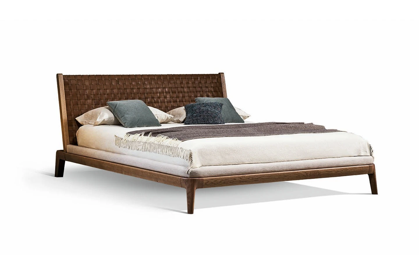 Двойното легло HONEYMOON е предназначено за тези, които освен дизайна ценят и умелото качество на изработка. Високото майсторство на ръчно плетената естествена кожа, характерна за таблата на леглото, и непрекъснатите извивки на рамката от масивна дървесина го превръщат в изключителен елемент, който обзавежда спалнята с характер. Изключителен и забележителен продукт, който се характеризира перфектно със срещата между орехово дърво и кожа, смело преплетени по отношение на пропорциите и естествения баланс. Рамката е обогатена с допълнителни детайли: ръбът, който обгръща периметъра на леглото, е тапициран с плат за по-голямо удобство.