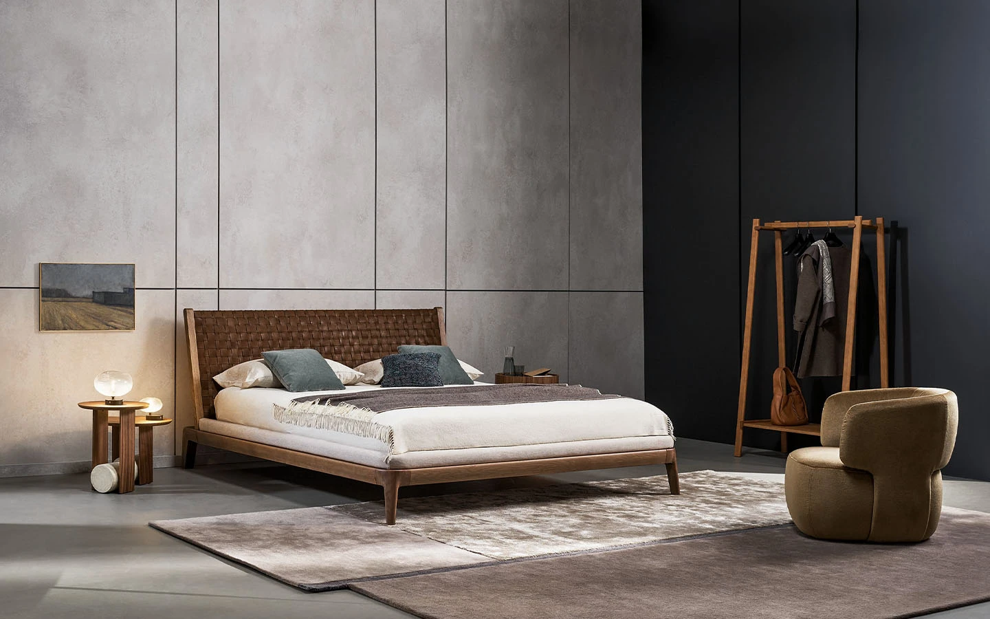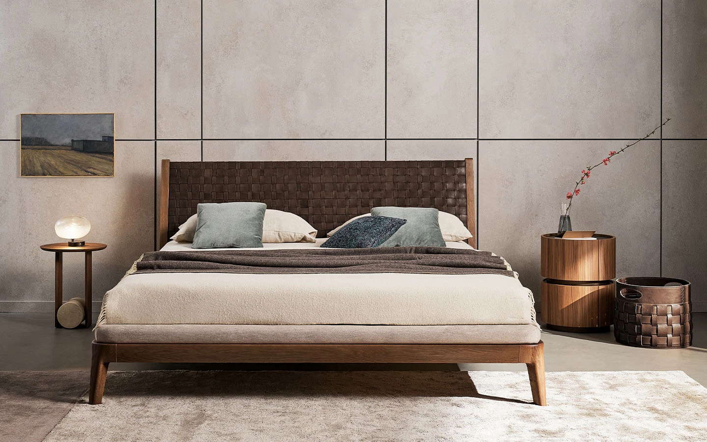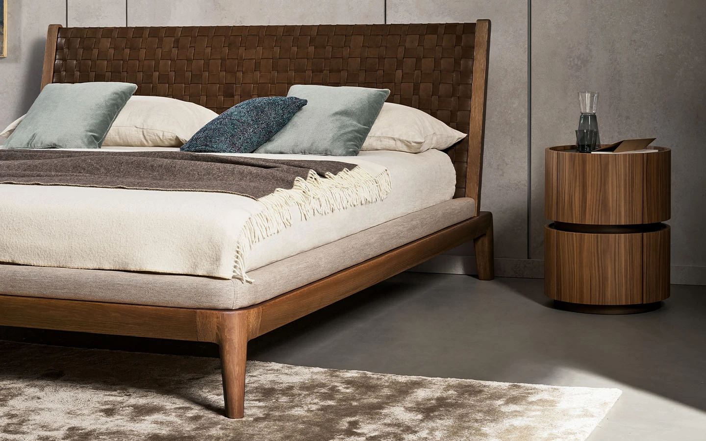 Двойното легло HONEYMOON е предназначено за тези, които освен дизайна ценят и умелото качество на изработка. Високото майсторство на ръчно плетената естествена кожа, характерна за таблата на леглото, и непрекъснатите извивки на рамката от масивна дървесина го превръщат в изключителен елемент, който обзавежда спалнята с характер. Изключителен и забележителен продукт, който се характеризира перфектно със срещата между орехово дърво и кожа, смело преплетени по отношение на пропорциите и естествения баланс. Рамката е обогатена с допълнителни детайли: ръбът, който обгръща периметъра на леглото, е тапициран с плат за по-голямо удобство.