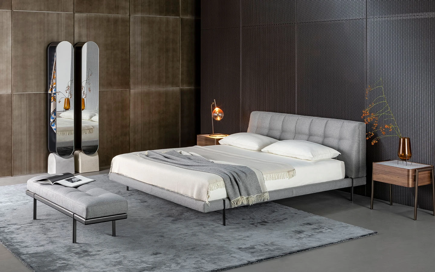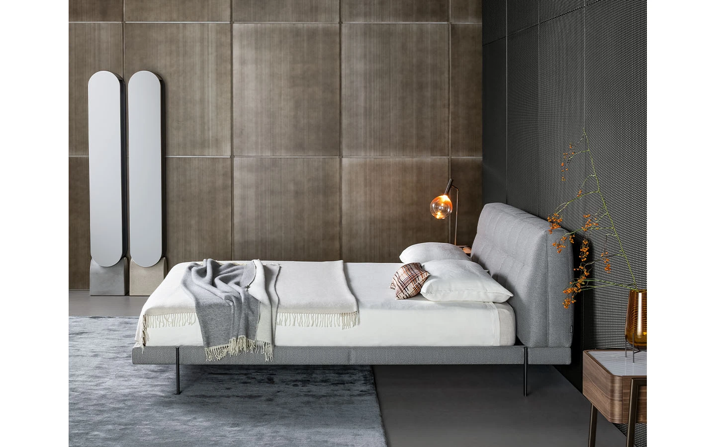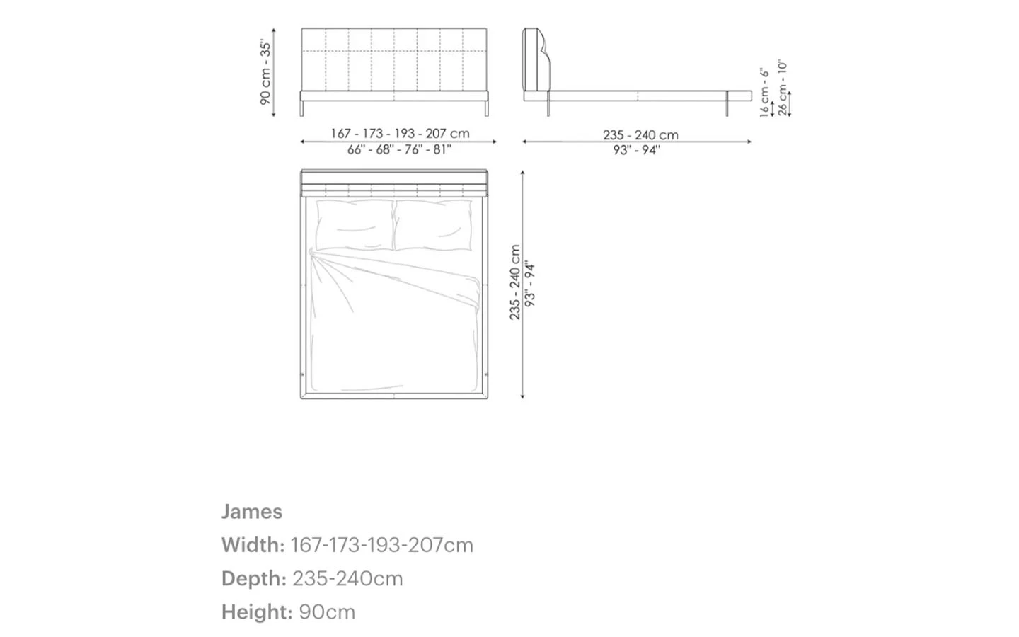 JAMES е спалня от колекцията на италианския производител Bonaldo. Италианското легло JAMES може да бъде тапицирано в дамаска, еко кожа или кожа – материал и цвят по избор на клиента. Моделът се предлага с метални крака във финиш по избор на клиента. Цената на леглото се формира на база на избора на вид тапицерия, финиш на метал и размер на матрака.