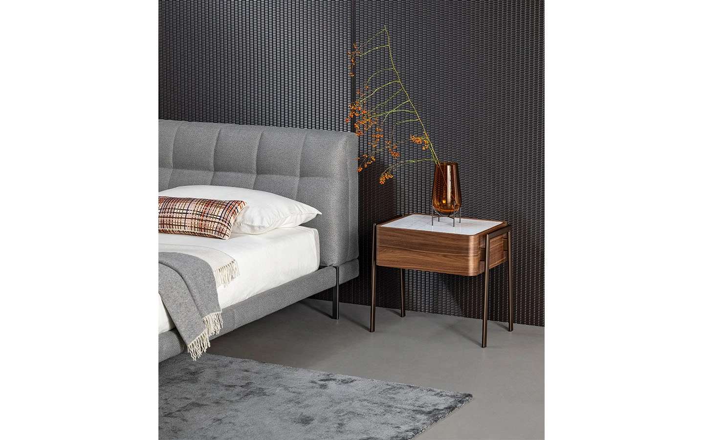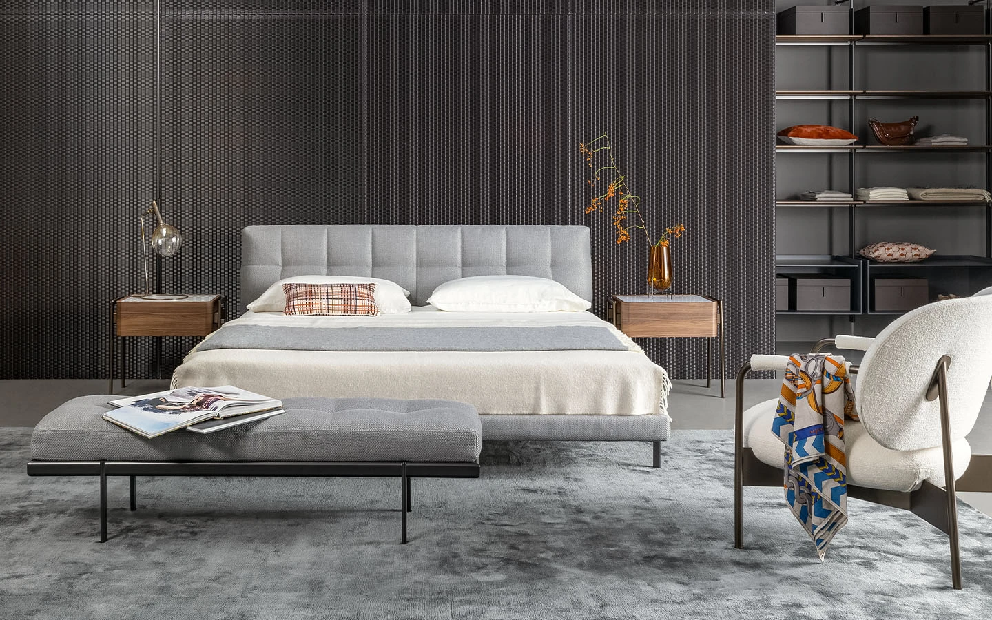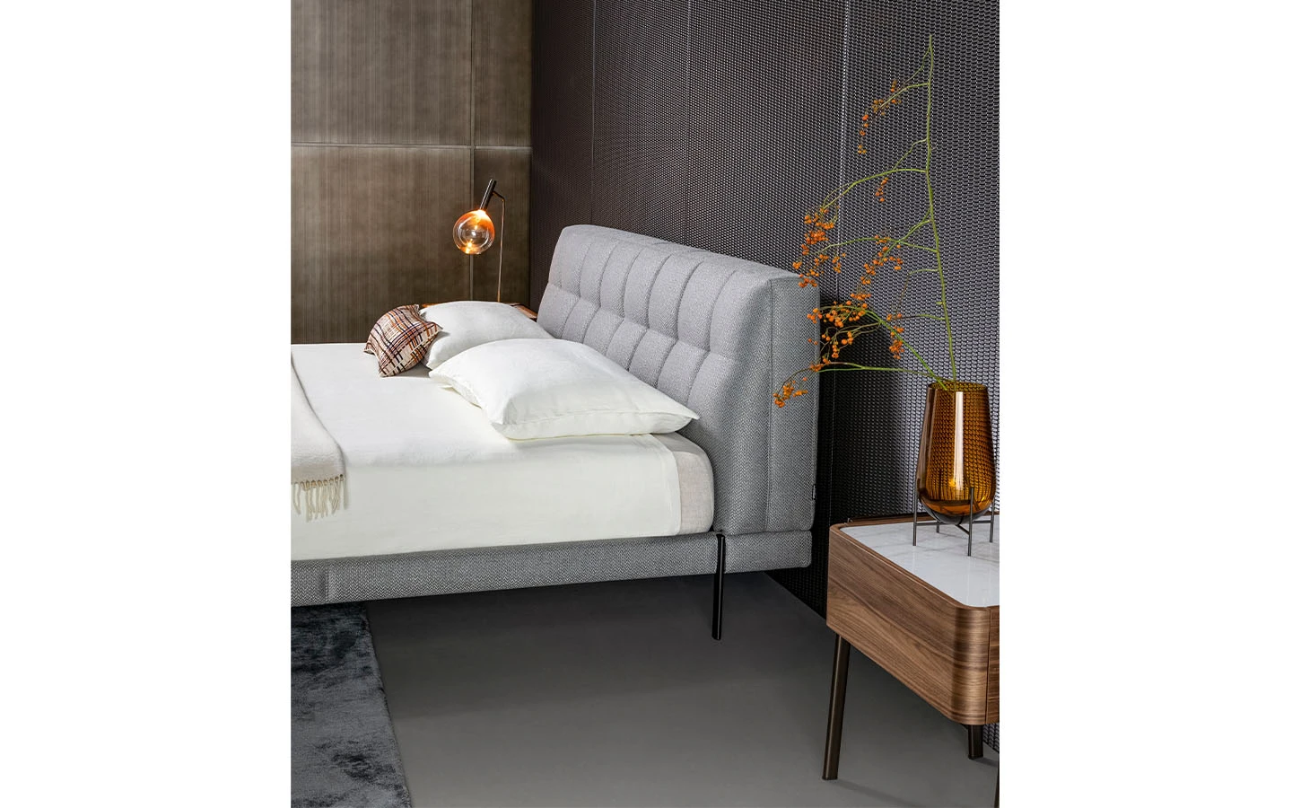 JAMES е спалня от колекцията на италианския производител Bonaldo. Италианското легло JAMES може да бъде тапицирано в дамаска, еко кожа или кожа – материал и цвят по избор на клиента. Моделът се предлага с метални крака във финиш по избор на клиента. Цената на леглото се формира на база на избора на вид тапицерия, финиш на метал и размер на матрака.