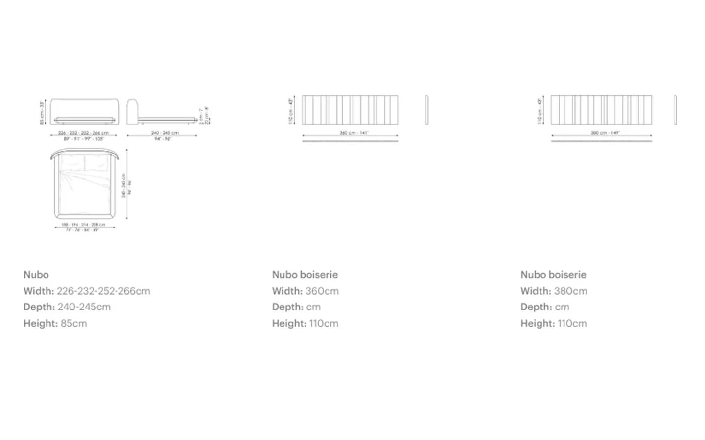 NUBO е легло от колекцията на италианския производител Bonaldo. Моделът се предлага в комбинация с ламперия NUBO. Леглото се предлага в различни размери и може да бъде тапицирано в дамаска, кожа или еко кожа – материал и цвят по избор. Ламперията NUBO също се предлага в различни размери и може да бъде тапицирана в дамаска, кожа или еко кожа – материал и цвят по избор. Цената на леглото се формира на база на избора на вид тапицерия и размер на матрака.