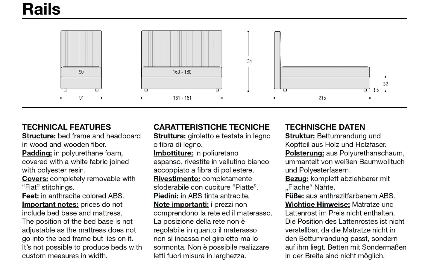 RAILS е легло от колекцията на италианския производител Flexteam. Италианското легло RAILS може да бъде тапицирано в дамаска или еко кожа – материал и цвят по избор на клиента. По желание леглото може да бъде поръчано с механизъм с контейнер. Цената на леглото се формира на база на избора на вид тапицерия и размер на матрака.
