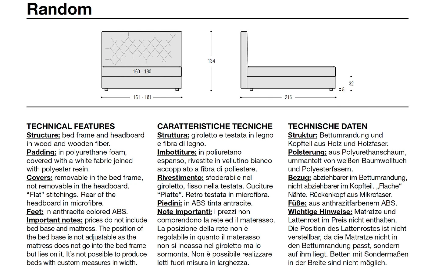 RANDOM е легло от колекцията на италианския производител Flexteam. Италианското легло RANDOM може да бъде тапицирано в кожа – цвят по избор на клиента. По желание леглото може да бъде поръчано с механизъм с контейнер. Цената на леглото се формира на база на избора на финиш на тапицерията и размер на матрака.