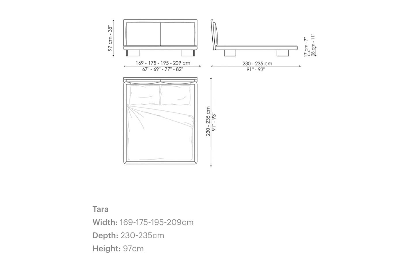 Леглото TARA е разработено от Giuseppe Viganò, като изхожда от концепция, която съчетава елегантност и строгост. Композицията се характеризира с есенциални обеми, обединени от основната правоъгълна геометрия, но различаващи се както по пропорции, така и по материали на тапицерията. Тънката и линейна поддържаща структура на леглото привлича вниманието към важната роля на меката и приветлива табла с две подплатени текстилни възглавници. Дизайнът е още по-интересен и привлекателен благодарение на тапицерията на канта на таблата с кожа, както и на краката.