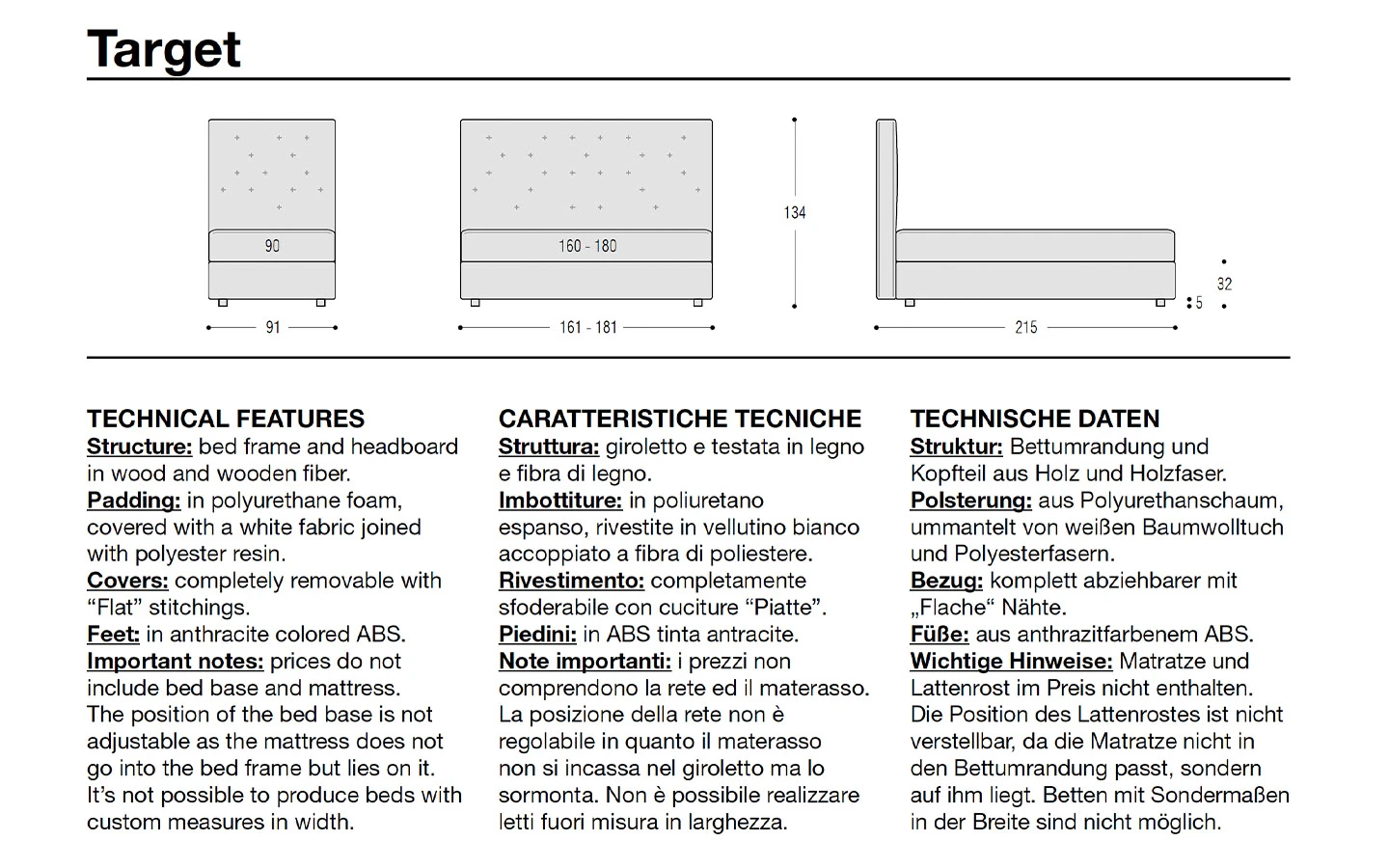 TARGET е легло от колекцията на италианския производител Flexteam. Италианското легло TARGET може да бъде тапицирано в дамаска или еко кожа – материал и цвят по избор на клиента. По желание леглото може да бъде поръчано с механизъм с контейнер. Цената на леглото се формира на база на избора на вид тапицерия и размер на матрака.