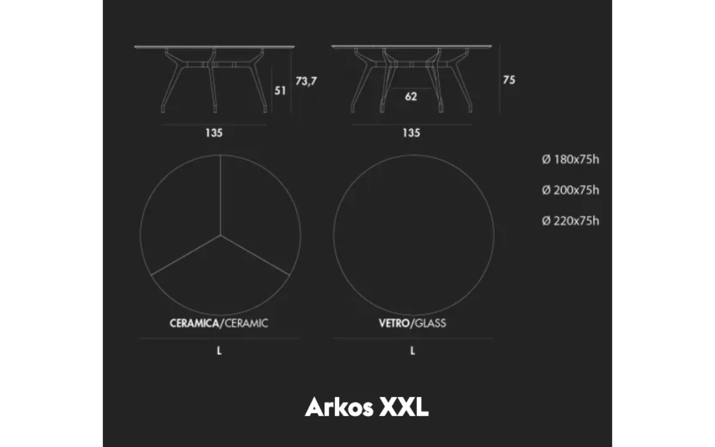 ARKOS XXL е италианска трапезарна маса от колекцията на италианския производител Sovet. Плотът на масата може да бъде изработен от прозрачно стъкло, прозрачно опушено, прозрачно бронзово, стъкло в различни цветове или керамика – материал и финиш по избор. Основата е от 6 крака, изработени от алуминий – финиш по избор на клиента. Опционално се предлага кръгла въртяща се поставка за обслужване на масата (Lazy Susan) – изработена от стъкло или керамика – финиш по избор. Цената на масата се формира на база избора на размер, материал и финиш на плота и финиш на основата.