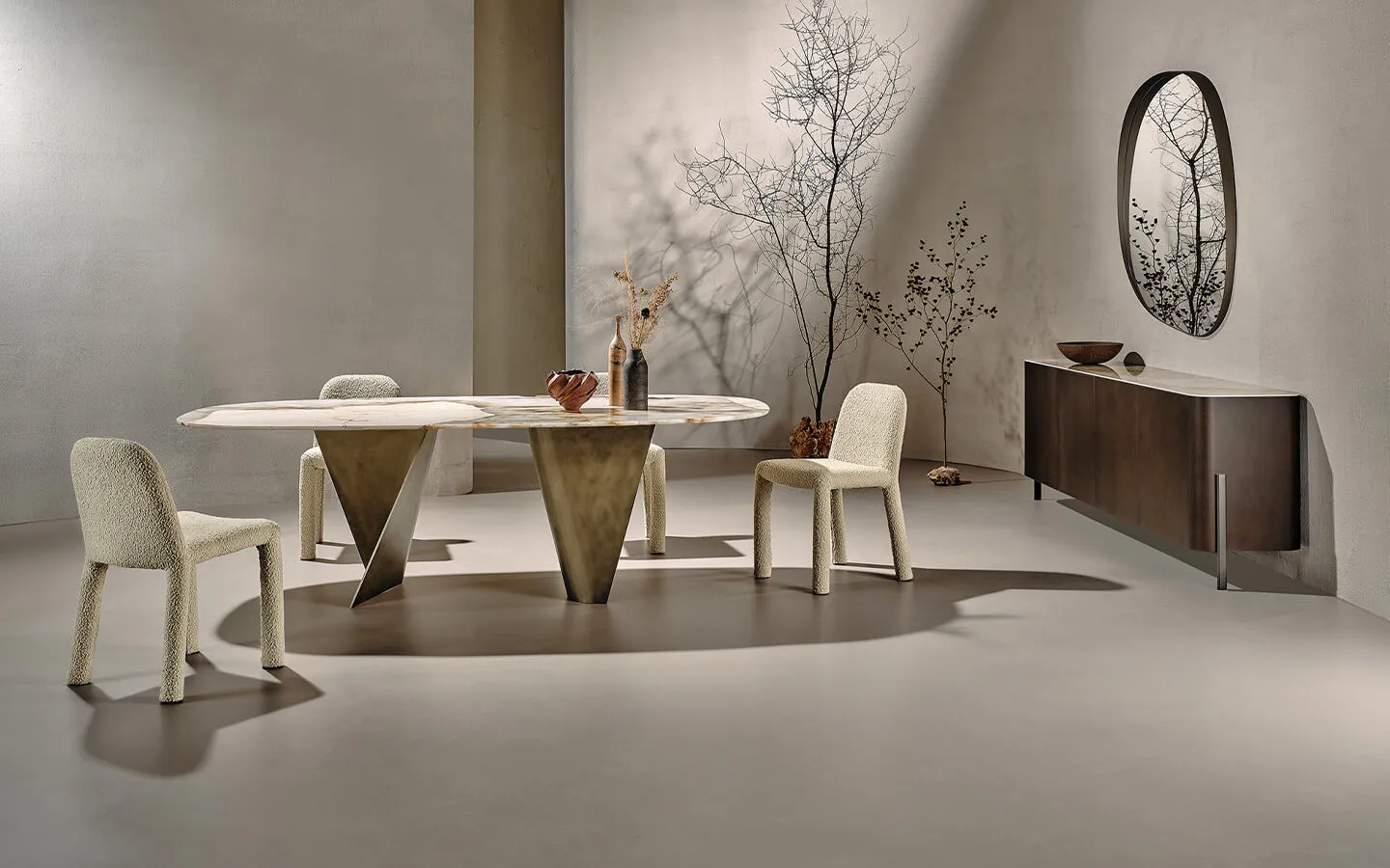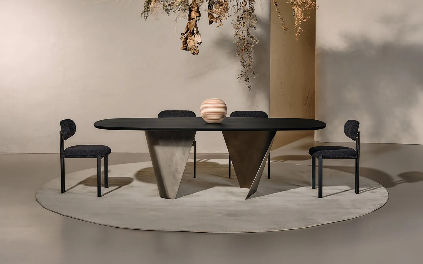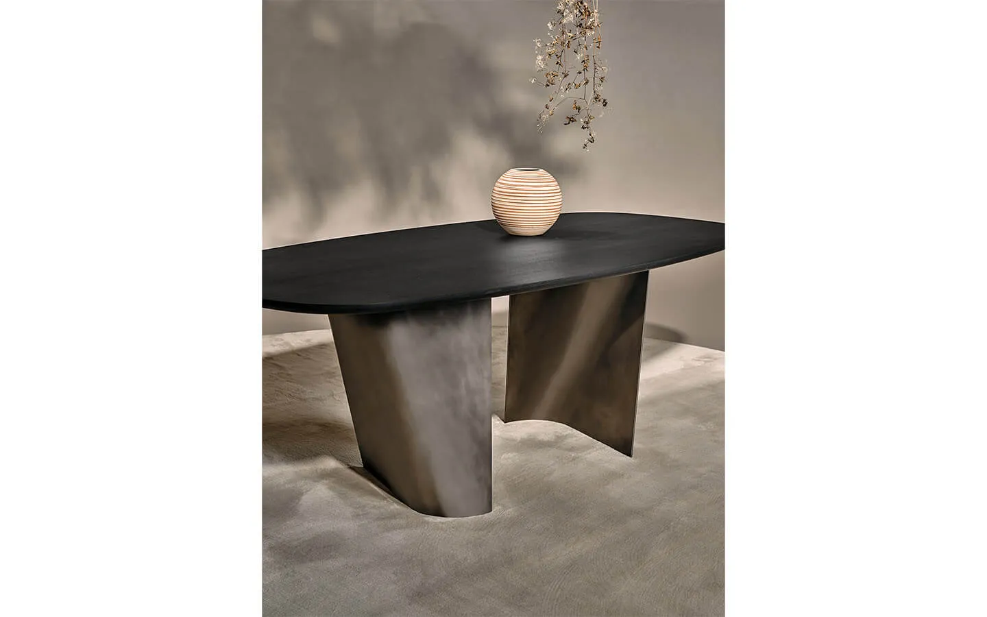 Трапезната маса BLOW на NATURE DESIGN впечатлява със своята елегантна и динамична визия, която създава усещане за движение дори в покой. Металната основа е скулптурна и изразителна, а плотът се предлага в разнообразие от материали – масивно дърво, мрамор, керамика или текстуриран Materico – което позволява персонализиране според стила на интериора. BLOW се предлага в няколко размера, включително кръгъл вариант, и е подходяща както за просторни трапезарии, така и за по-интимни пространства, където масата да бъде централният акцент. Изчистените линии и играта на светлина и сенки по повърхността я превръщат в истинско бижу за модерния дом.
