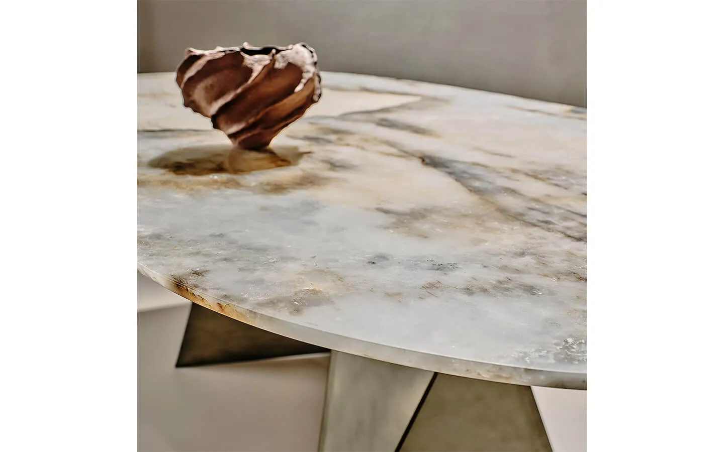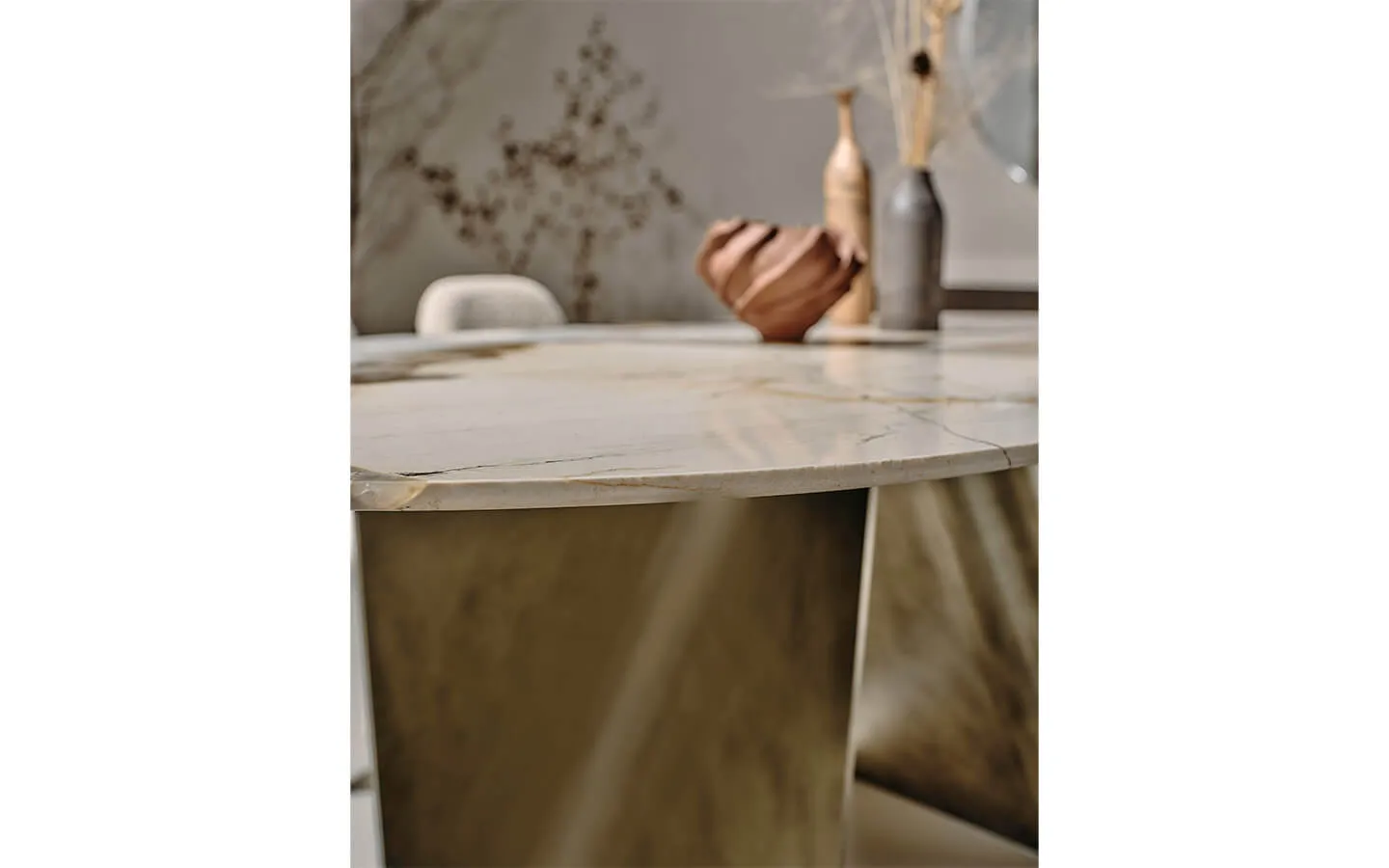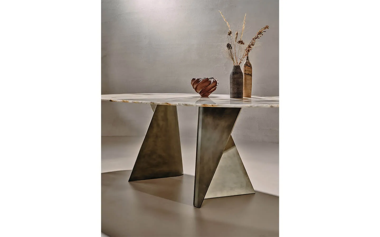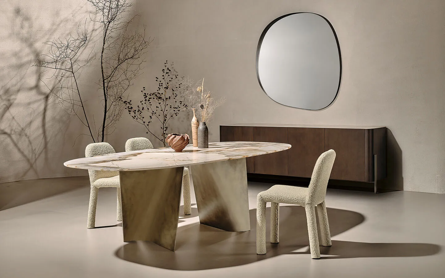 Трапезната маса BLOW на NATURE DESIGN впечатлява със своята елегантна и динамична визия, която създава усещане за движение дори в покой. Металната основа е скулптурна и изразителна, а плотът се предлага в разнообразие от материали – масивно дърво, мрамор, керамика или текстуриран Materico – което позволява персонализиране според стила на интериора. BLOW се предлага в няколко размера, включително кръгъл вариант, и е подходяща както за просторни трапезарии, така и за по-интимни пространства, където масата да бъде централният акцент. Изчистените линии и играта на светлина и сенки по повърхността я превръщат в истинско бижу за модерния дом.
