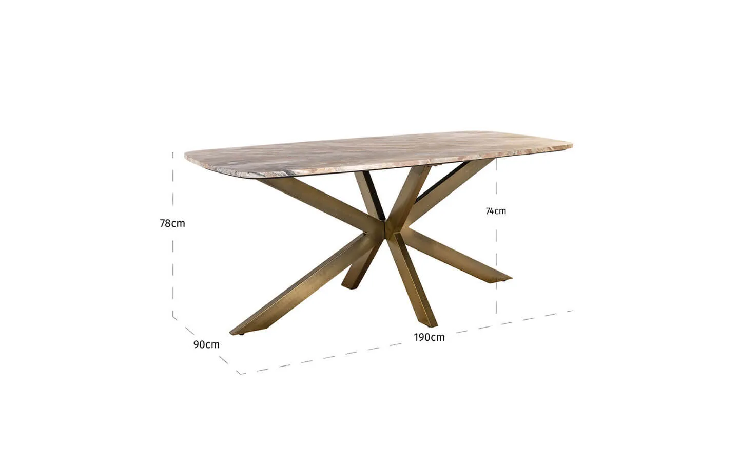 Трапезната маса BOTTEGA BLUSH BEIGE DANISH OVAL 190 на RICHMOND INTERIORS впечатлява с изискан заоблен силует и луксозно присъствие, което я прави силен акцент във всяка модерна трапезария. Плотът е изработен от естествен мрамор Toronto marble в мек нюанс blush beige, който придава топлина, дълбочина и елегантен характер на модела. Масивната метална основа в златист финиш е оформена в характерен „spider“ дизайн, който съчетава стабилност и скулптурна естетика. С дължина 190 см, ширина 90 см и височина 76 см, масата предлага комфортно пространство за ежедневни и специални моменти. Комбинацията от мрамор, желязо и месинг подчертава премиум качеството и вниманието към детайла, характерни за RICHMOND INTERIORS, превръщайки модела в изтънчен център на интериора.