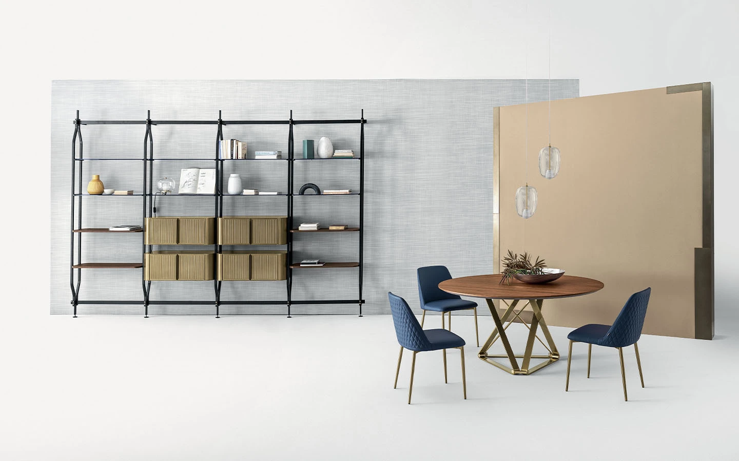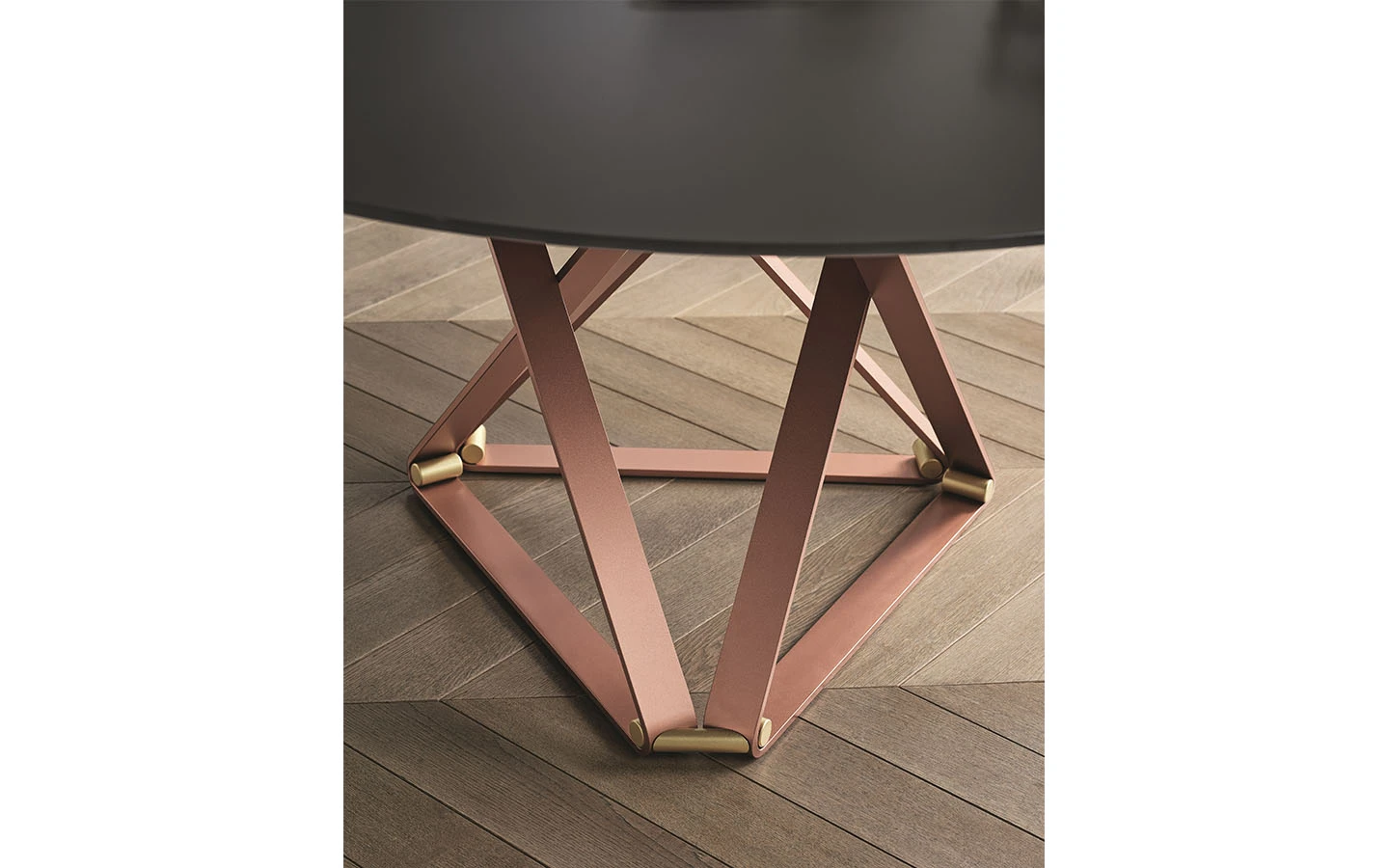 Масата DELTA ROUND от Bontempi Casa е изискана трапезна маса, която съчетава модерен дизайн и функционалност. Проектирана от дизайнерите Bernhardt & Vella, тя се отличава със своята характерна геометрична основа, съставена от кръстосани метални греди с декоративни елементи, които поддържат кръгъл плот. Основата и декоративните елементи са изработени от метал и се предлагат в различни покрития, което позволява персонализиране според разнообразни интериорни стилове. Кръглият плот на масата е наличен в разнообразие от висококачествени материали.Тези материали са известни със своята издръжливост и естетическа привлекателност, което прави масата едновременно практична и елегантна.