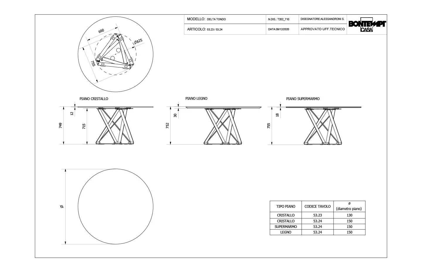 DELTA ROUND е италианска трапезарна маса от колекцията на италианския производител Bontempi Casa. Плотът на масата може да бъде изработен от фурнировано дърво, лъскаво стъкло, матово стъкло с покритие против надраскване или керамика – материал и финиш по избор. Основата е изработена от метал – финиш по избор на клиента. Цената на масата се формира на база избора на размер, материал и финиш на плота и финиш на основата.