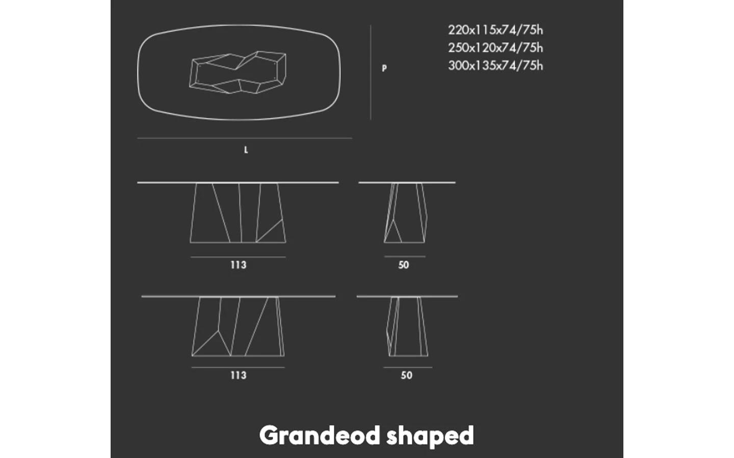 GRANDEOD SHAPED е италианска трапезарна маса от колекцията на италианския производител Sovet. Плотът на масата може да бъде изработен от прозрачно стъкло, прозрачно опушено, прозрачно бронзово, стъкло в различни цветове, сатинирано стъкло, стъкло Net, стъкло Liquid, стъкло Materia или керамика – материал и финиш по избор. Основата е изработена от метал – финиш по избор на клиента. Цената на масата се формира на база избора на размер, материал и финиш на плота и финиш на основата.