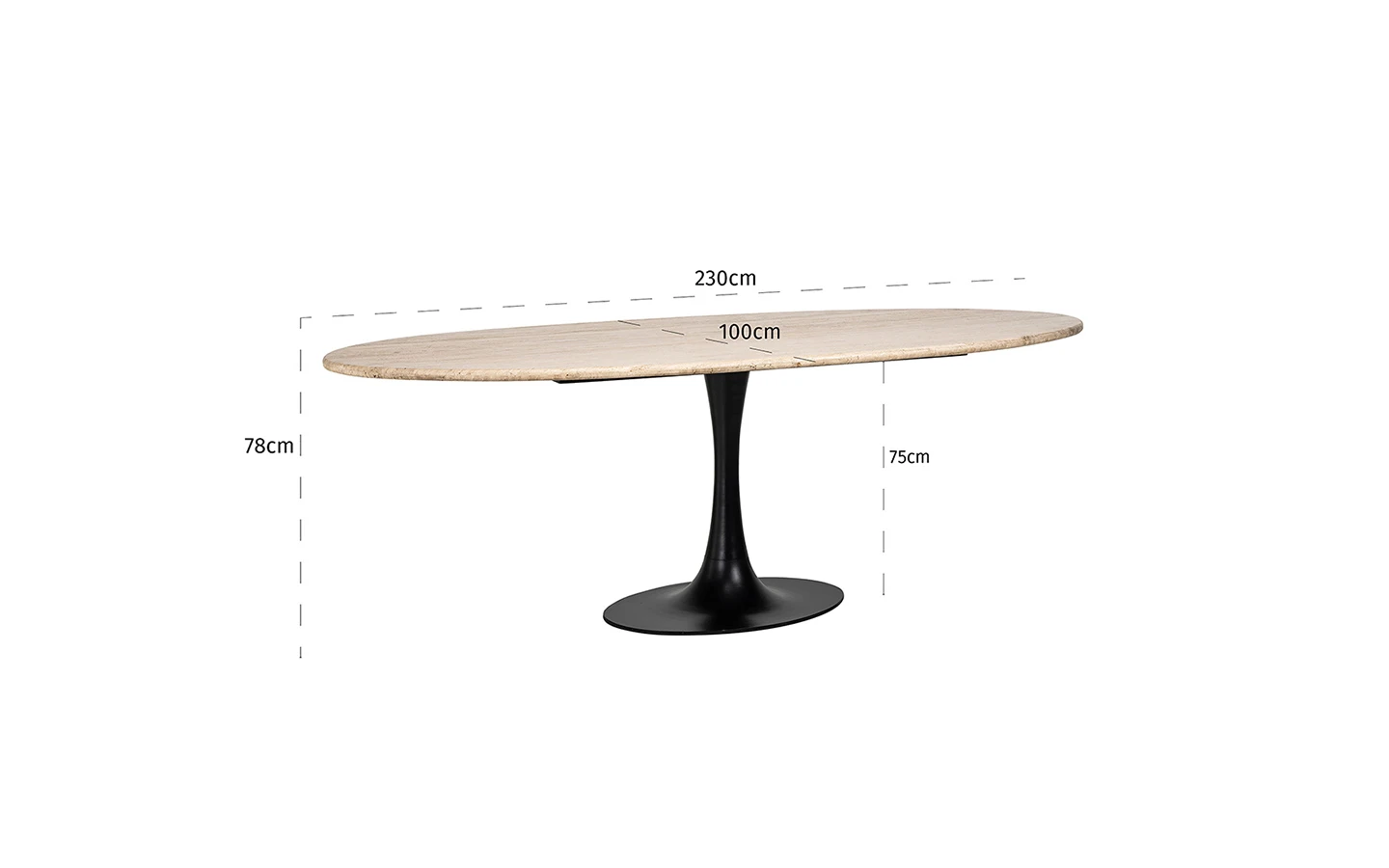 HAMPTON OVAL 230 е трапезна маса от колекцията на нидерландския производител Richmond Interiors. Основата е изработена от метал – финиш Black. Плотът на трапезната маса е изработен от естествен мрамор Travertine.