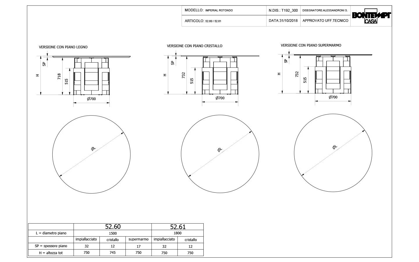 IMPERIAL ROUND е италианска трапезарна маса от колекцията на италианския производител Bontempi Casa. Плотът на масата може да бъде изработен от фурнировано дърво, прозрачно стъкло, прозрачно опушено стъкло, матово стъкло с покритие против надраскване или керамика – материал и финиш по избор. Опционално масата се предлага с централен въртящ се елемент (Lazy Susan) – финиш по избор. Основата е изработена от метал – финиш по избор на клиента. Цената на масата се формира на база избора на размер, материал и финиш на плота и финиш на основата.