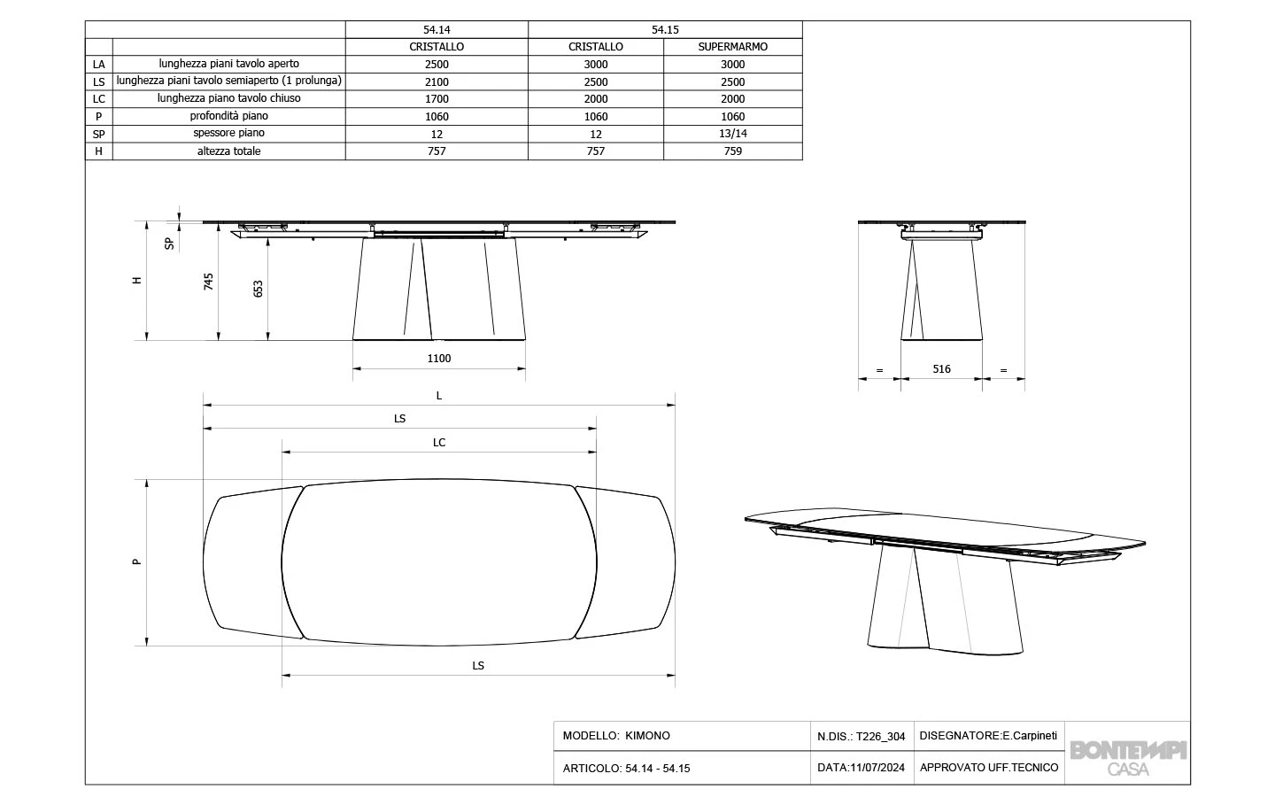 KIMONO е италианска трапезарна маса от колекцията на италианския производител Bontempi Casa. Плотът на масата може да бъде изработен от фурнировано дърво, масивно дърво, арт стъкло, метализирано бронзово стъкло, лъскаво стъкло, матово стъкло с покритие против надраскване или керамика – материал и финиш по избор. Масата се предлага с праовъгълна и правоъгълна със заоблени ръбове форма на плота. Също така, масата може да се поръча и с разтегателен плот. Основата е изработена от метал – финиш по избор на клиента. Цената на масата се формира на база избора на размер, форма, материал и финиш на плота и финиш на основата.