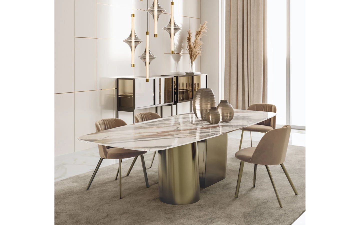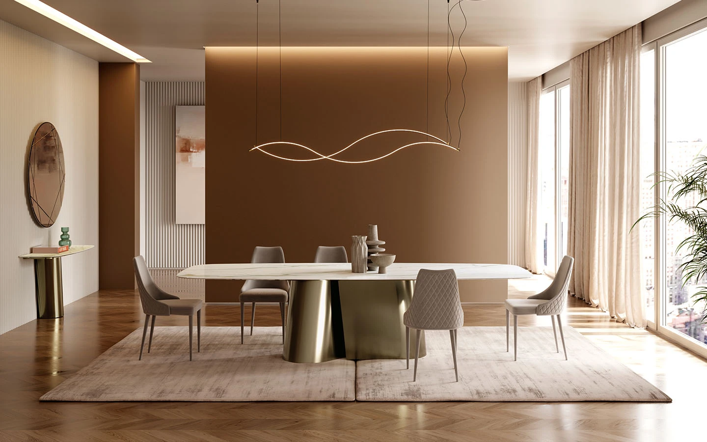 Масата KIMONO от Bontempi Casa е съвременна трапезна маса, която съчетава модерен дизайн и изключително майсторство. Проектирана от дизайнерското студио E-GGS, тя се отличава с характерна основа от метал, вдъхновена от гънките на традиционното японско кимоно, което придава на масата както стабилност, така и впечатляващ визуален акцент. Централната основа е изработена от метал и се предлага в различни покрития. Това разнообразие позволява персонализиране според различни интериорни стилове. Комбинацията от уникалната основа, вдъхновена от кимоно, и премиум материалите на плота прави масата KIMONO впечатляващ централен елемент както в съвременни, така и в класически интериори. Тя предлага хармоничен баланс между форма и функционалност.